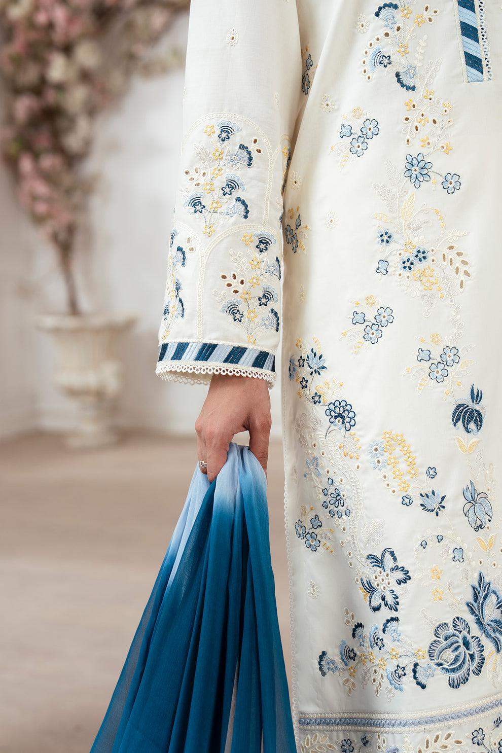 Includes: Embroidered Lawn Shirt, Printed Chiffon Dupatta, Plain Cotton Trouser