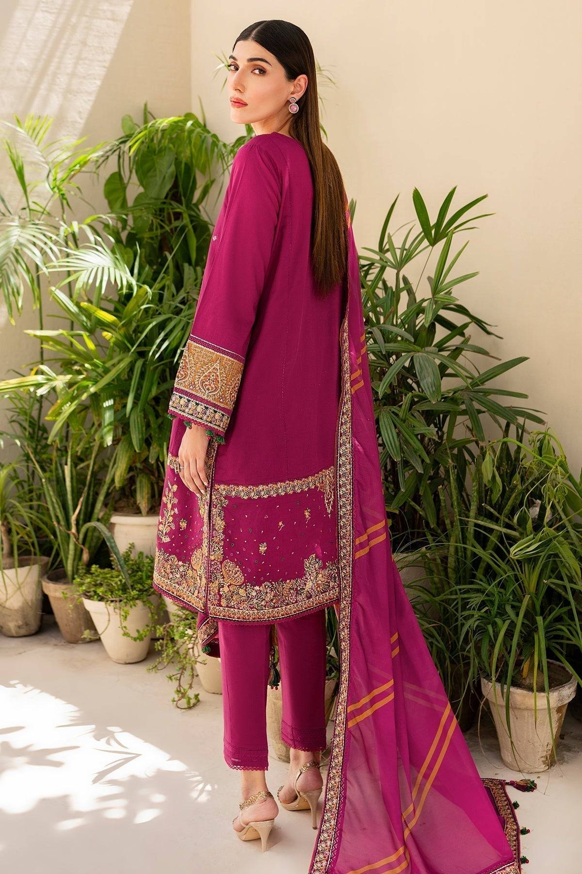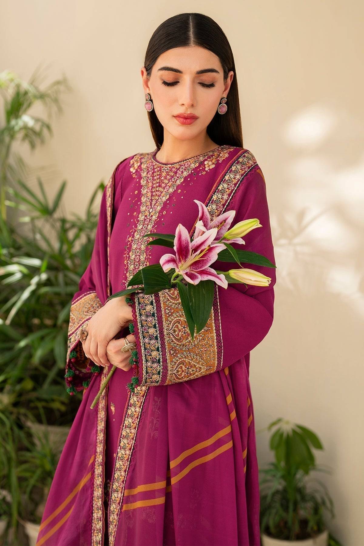 Step into elegance with this Jazmin maroon lawn ensemble from the Irish Lawn SS24 Collection. The shirt features an embroidered dobby lawn front yoke and panels, complemented by intricately embroidered sleeves and front & back borders. The dyed cambric trousers offer a comfortable, tailored fit, while the digitally printed tissue silk dupatta adds a delicate, flowing finish. The dyed dobby lawn back completes the look, creating a harmonious blend of contemporary design and traditional embroidery. Perfect for festive gatherings, casual events, or daytime celebrations, this ensemble exudes timeless charm and sophisticated style.