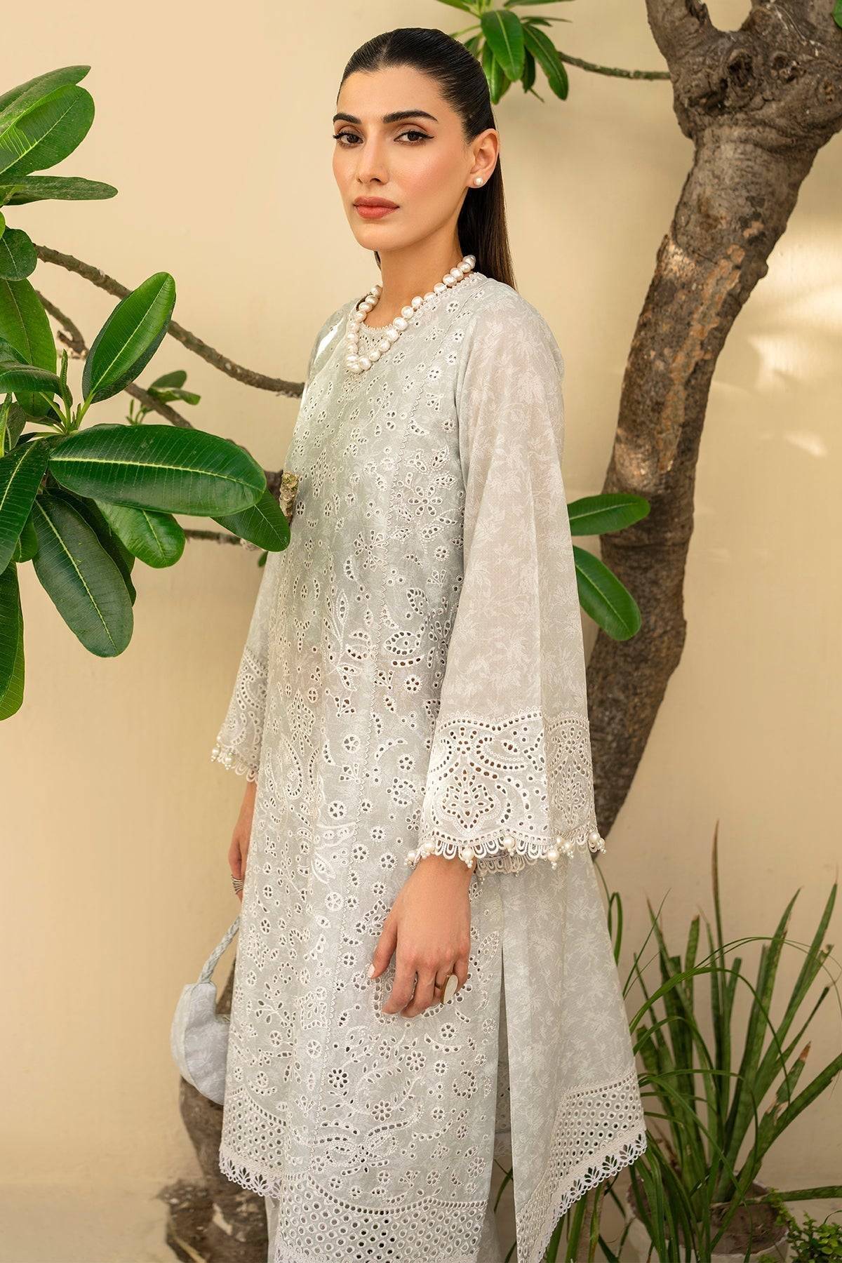Elevate your wardrobe with this Jazmin off-white lawn ensemble from the Irish Lawn SS24 Collection. Crafted from premium lawn fabric, the shirt features a digitally printed embroidered front panel and side panels, perfectly balanced with embroidered sleeves and front & back borders. The dyed cambric trousers provide a refined and comfortable fit, while the set includes two dupattas — a digitally printed organza dupatta with delicate embroidered borders and a staple dobby net dupatta for added versatility. Ideal for festive gatherings or casual daytime events, this ensemble seamlessly combines contemporary prints with intricate embroidery, ensuring a look of effortless elegance.