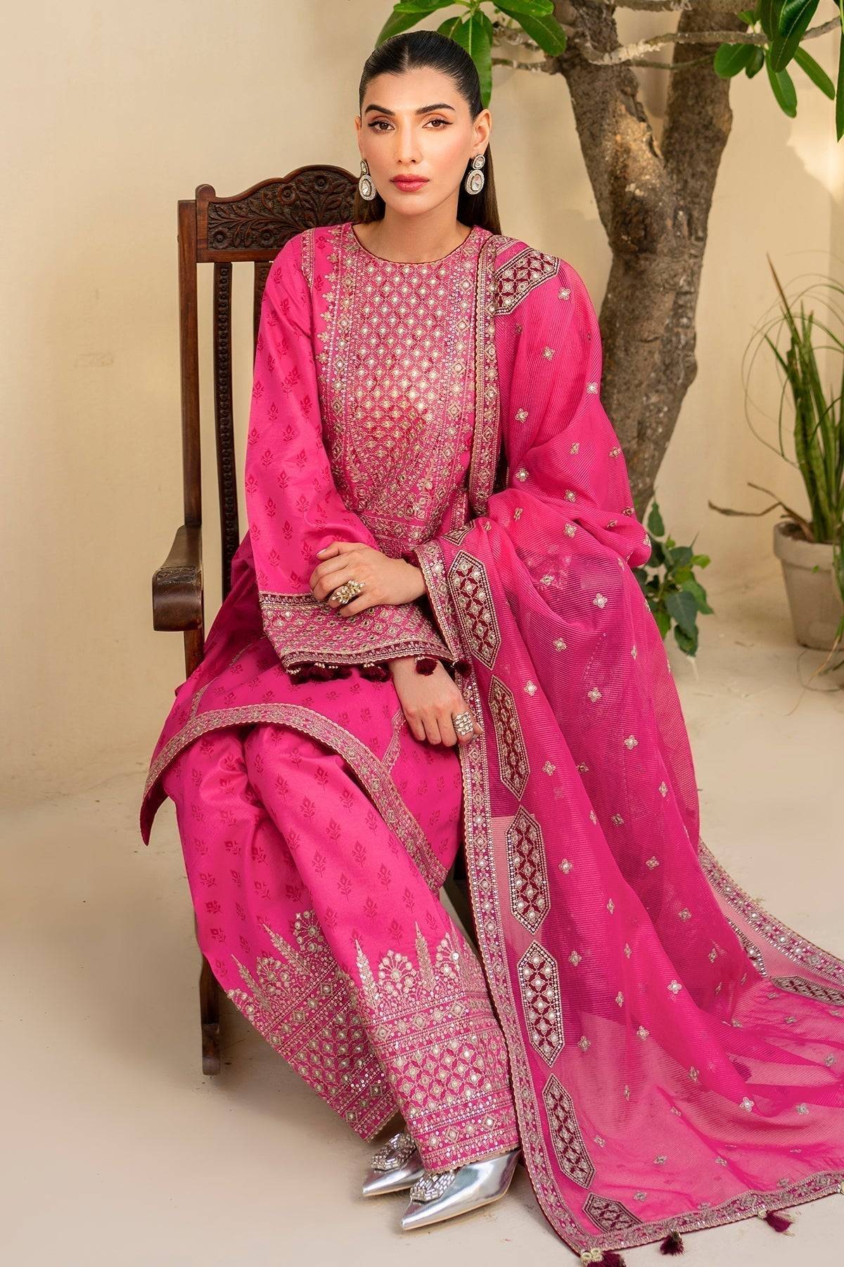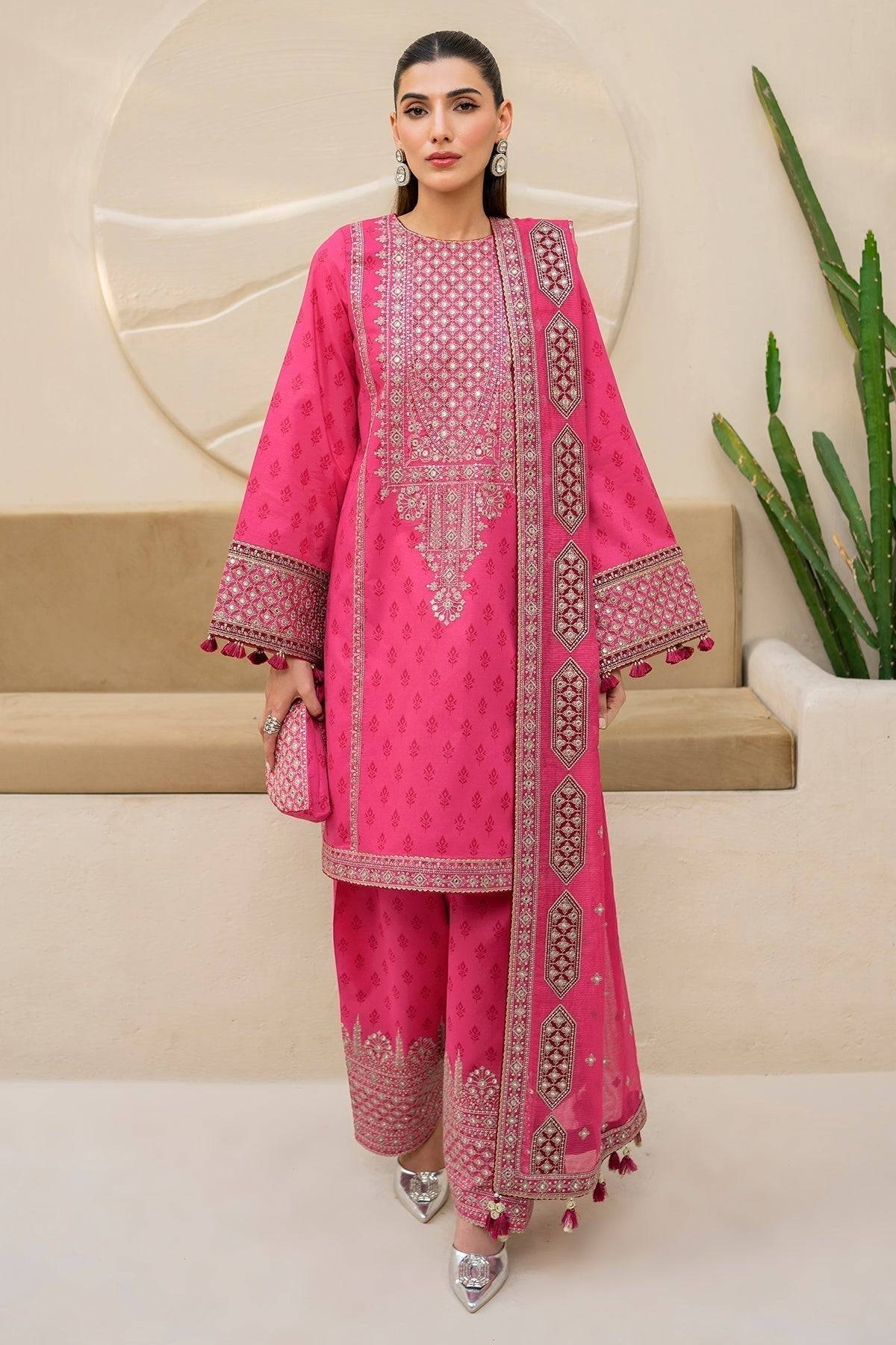 Step into effortless elegance with this Jazmin pink ensemble from the Irish Lawn SS24 Collection. The shirt is crafted from premium rotary-printed lawn and adorned with intricate embroidery across the front, back, sleeves, and borders, adding subtle sophistication and charm. The rotary-printed lawn trousers complement the shirt perfectly, offering a comfortable and stylish silhouette. Completing the look is a staple dobby net dupatta with exquisite laser technique embroidery, providing an airy and contemporary finish. This ensemble is perfect for those seeking a harmonious blend of traditional craftsmanship and modern lawn fashion.