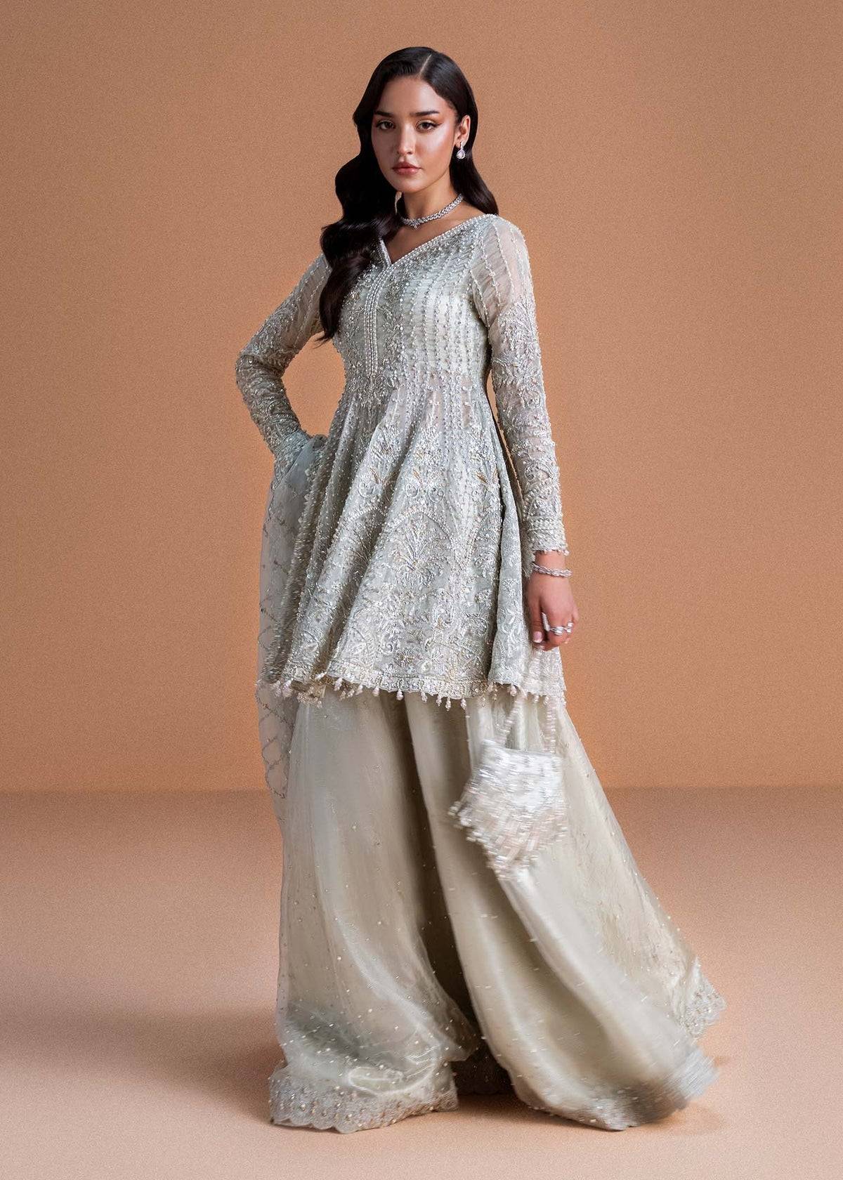 Radiate elegance in this refined moonlit silver peplum ensemble from Kanwal Malik’s Saheli Luxury Pret 24 collection. The sleek tissue shirt features tailored sleeves and is lavishly adorned with intricate embroidery and delicate ada work, lending it a luxurious texture and subtle gleam. Paired with coordinating tissue pants enhanced by a soft gradient spray effect, the set strikes a perfect balance between modern glamour and timeless charm. A sheer, flowy organza dupatta completes the look, adding lightness and grace, ideal for festive soirees and formal celebrations.