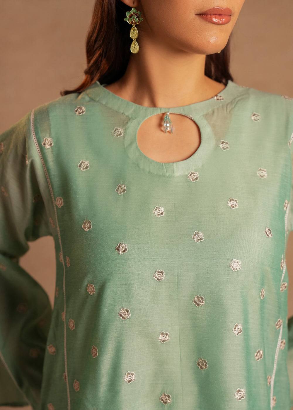 A soothing mint lawn cotton kurta adorned with delicate embroidery and a soft keyhole neckline detail. Paired with structured karandi trousers, this ensemble blends breezy charm with quiet sophisticationperfect for serene summer days.