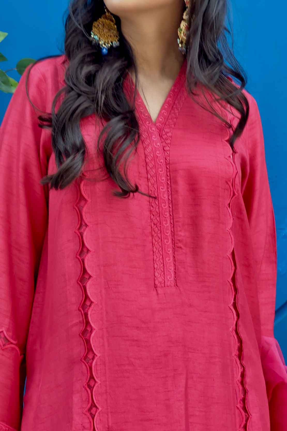 this delightful hot pink silk ensemble features mesmerising scallop and lace details paired with a raw silk trouser. The organza dupatta adds the perfect finishing to this stunning outfit. There are so many ways this outfit can be styled.