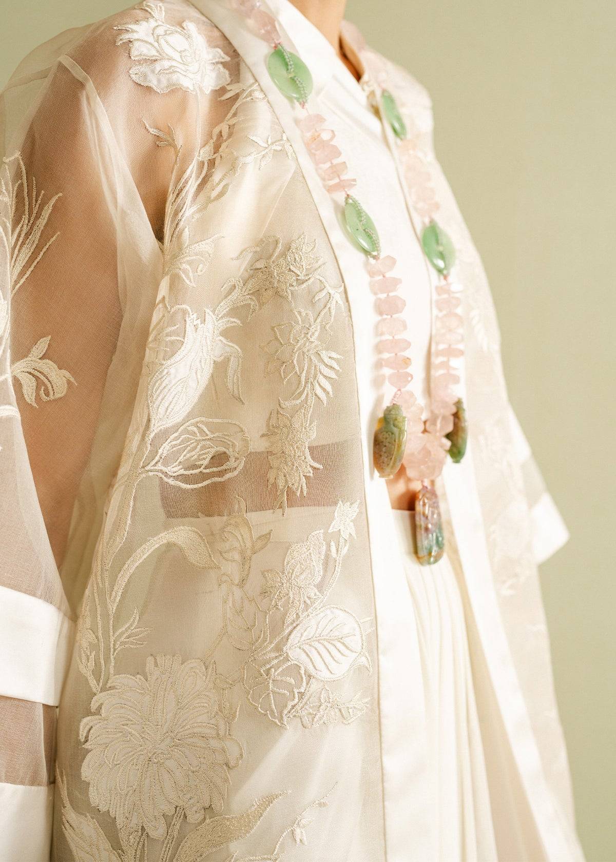 Ayana from Ayana's Garden a vision of timeless poise in ethereal ivory. This three-piece ensemble features a sheer organza jacket, delicately flowing over a self-jamawar blouse that radiates quiet opulence. Paired with a fluid chiffon sharara, the look is an ode to graceful movement and understated grandeur.