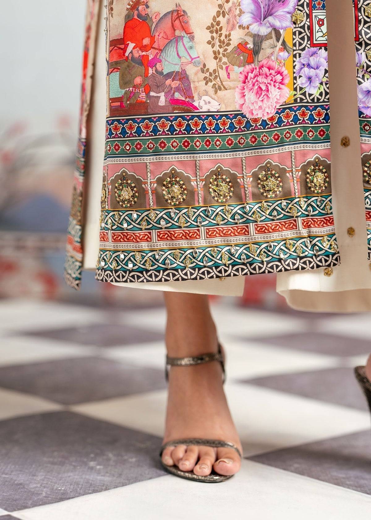Old Stories from Echoes of Elara is a poetic blend of heritage and contemporary charm. Crafted from luxurious grip silk, the printed long shirt is adorned with intricate hand and gota work, weaving artistry into every detail. Paired with sleek raw silk trousers, this ensemble tells a tale of tradition reimagined with modern elegance.