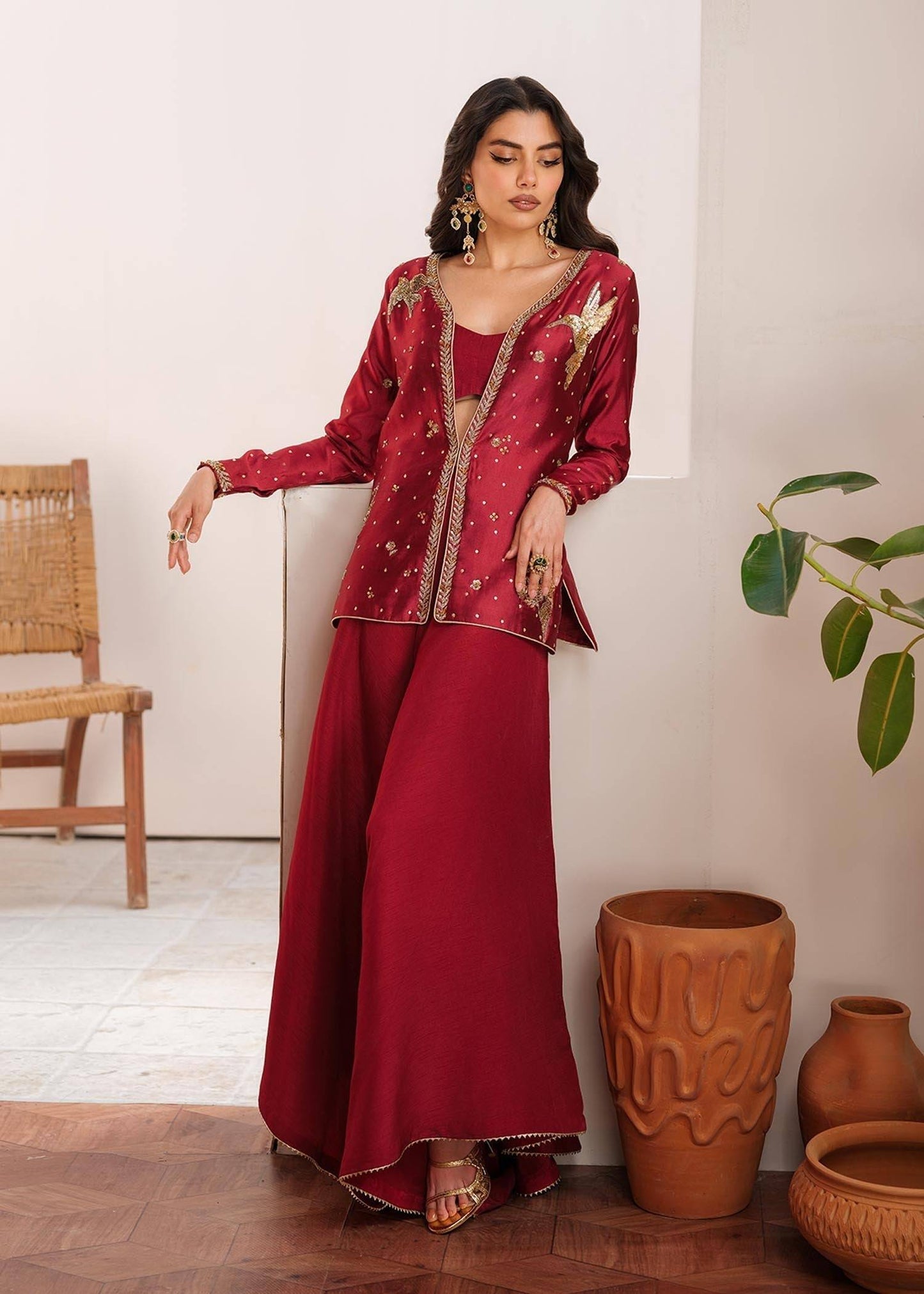 This stunning jacket highlights a lovely bird motif, adorned with handcrafted detailing and shimmering crystals. Paired elegantly with loose pants, the overall look is truly captivating.