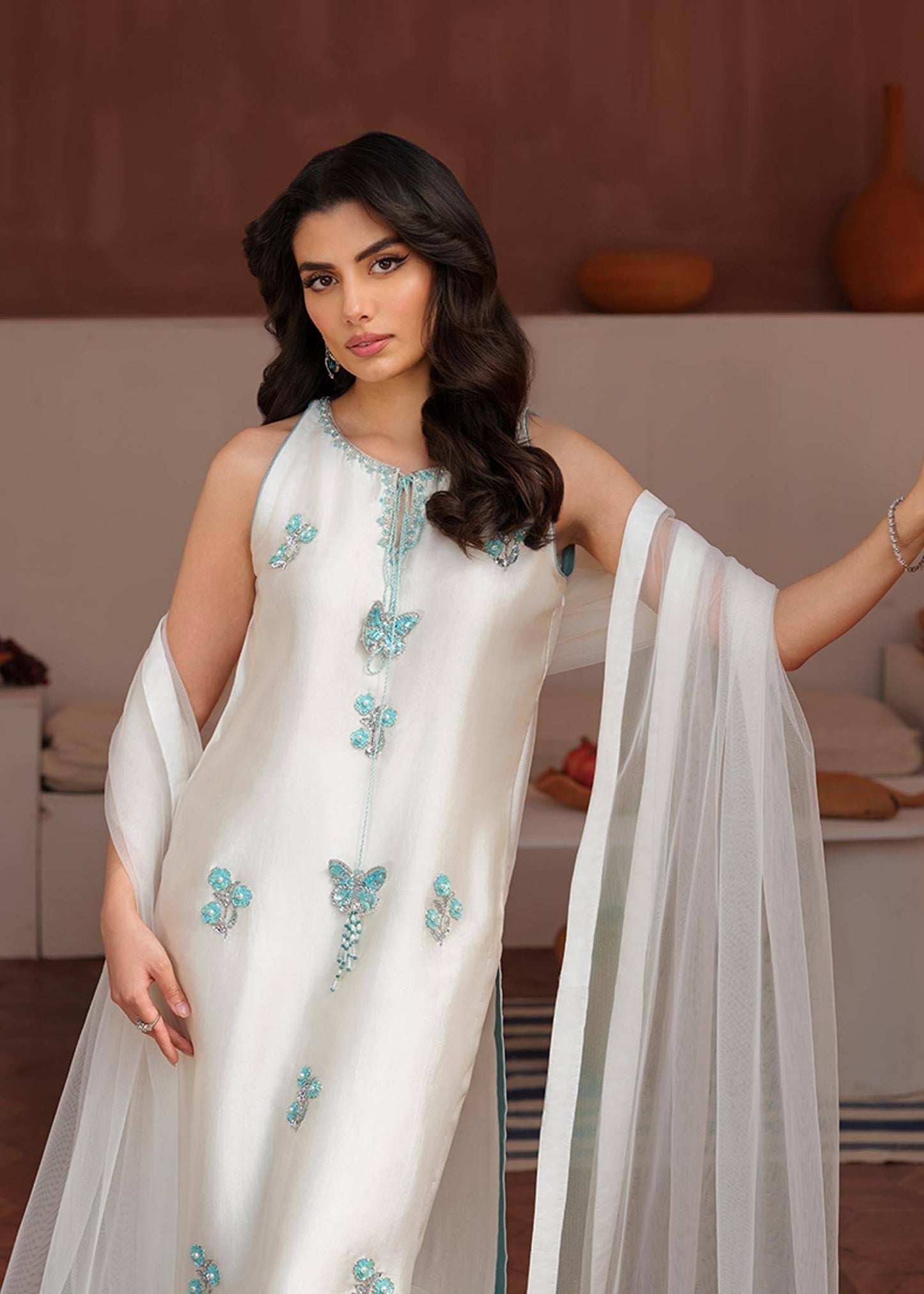 The ivory piece is intricately adorned with hand-embellished floral motifs in shades of blue and silver, embellished with beautiful pipes and sequins. It is paired with flared pants and a three-tone gathered dupatta to complement the look.