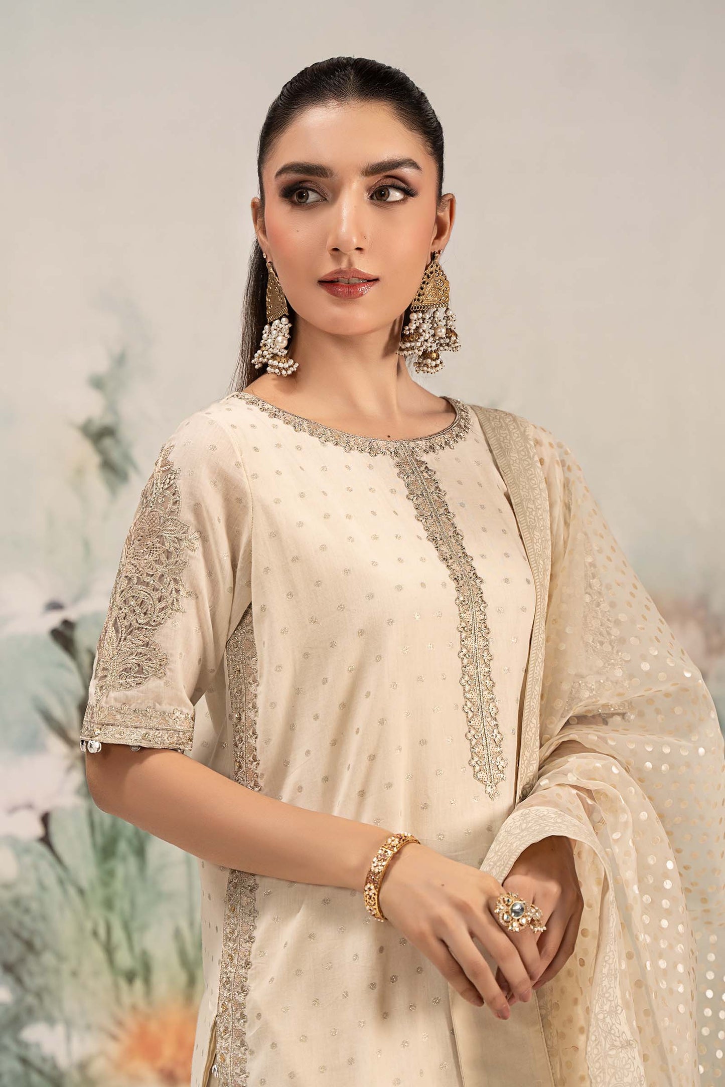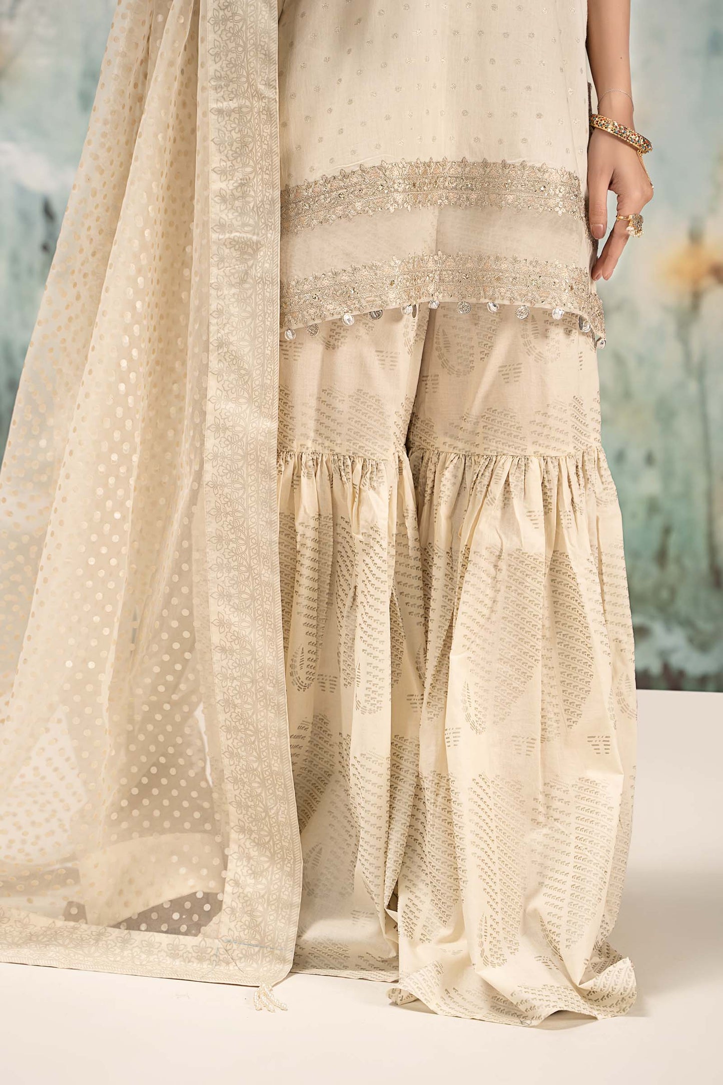 Step into elegance with this off-white four-piece ensemble from Maria. B’s Ready To Wear collection. The straight-cut cotton lurex shirt is styled with a round embroidered neckline, embroidered side seams, and an organza embroidered border. Half sleeves feature organza embroidered motif borders finished with gotta balls and coin detailing for a delicate festive charm. It comes with a dyed lawn sleeveless undershirt, a screen-printed cambric gharara with elasticated waistband, and a screen-printed organza dupatta adorned with pearl tassel detailing along all four borders. This refined design strikes the perfect balance between modern flair and timeless tradition.