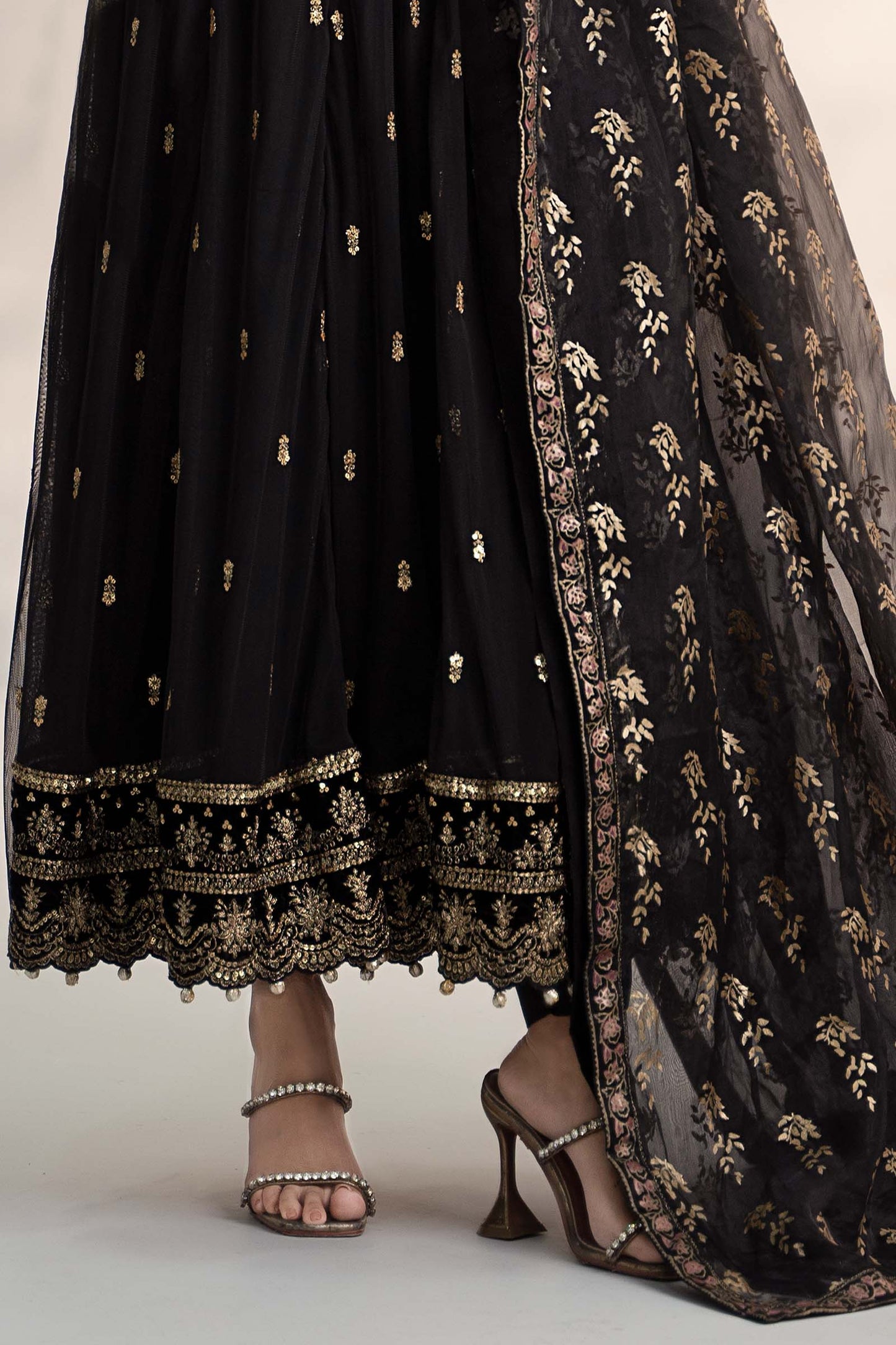 This black frock features a round embroidered neckline, dyed front with embroidery, and velvet embroidered border. The sleeves are fully embroidered with velvet borders and gotta balls detailing. It is paired with a dyed sleeveless green undershirt and straight-fit green trousers with an elasticated waistband. The ensemble is completed with a dyed block printed organza dupatta, creating a stylish and ready-to-wear festive outfit.