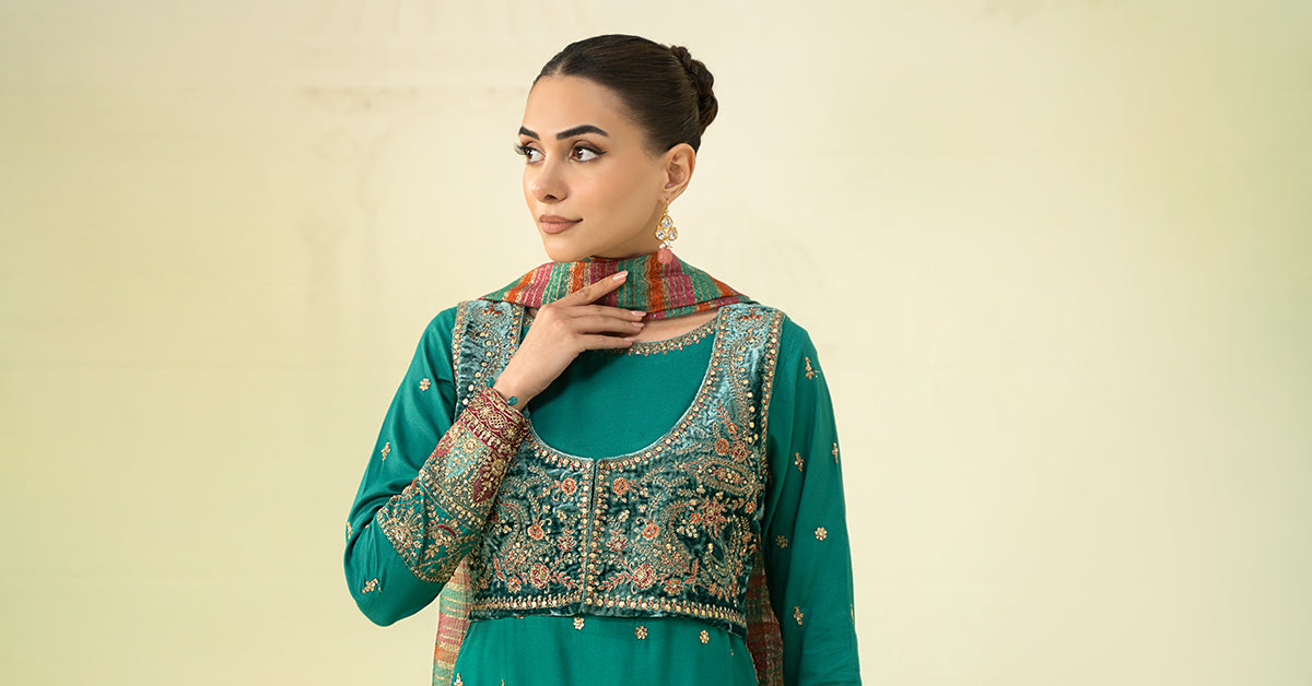 Fabric: Linen (Shirt & Trousers), Velvet (Koti), Yarn Dyed Khaadi (Dupatta)