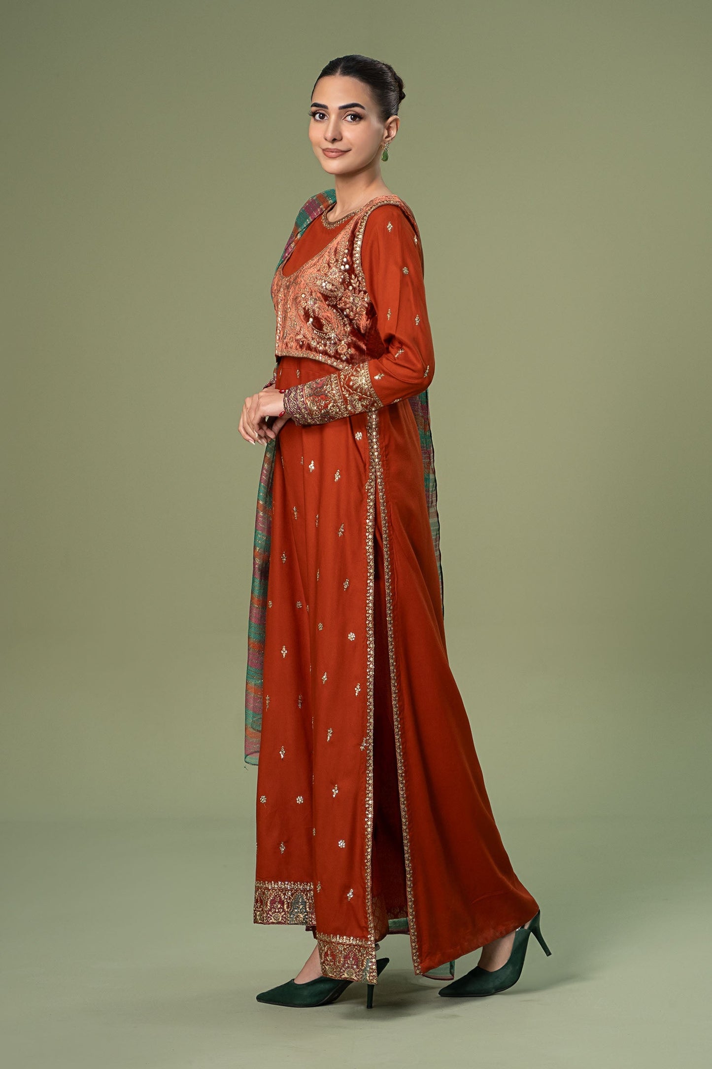 Fabric: Linen (Shirt & Trousers), Velvet (Koti), Yarn Dyed Khadi (Dupatta)