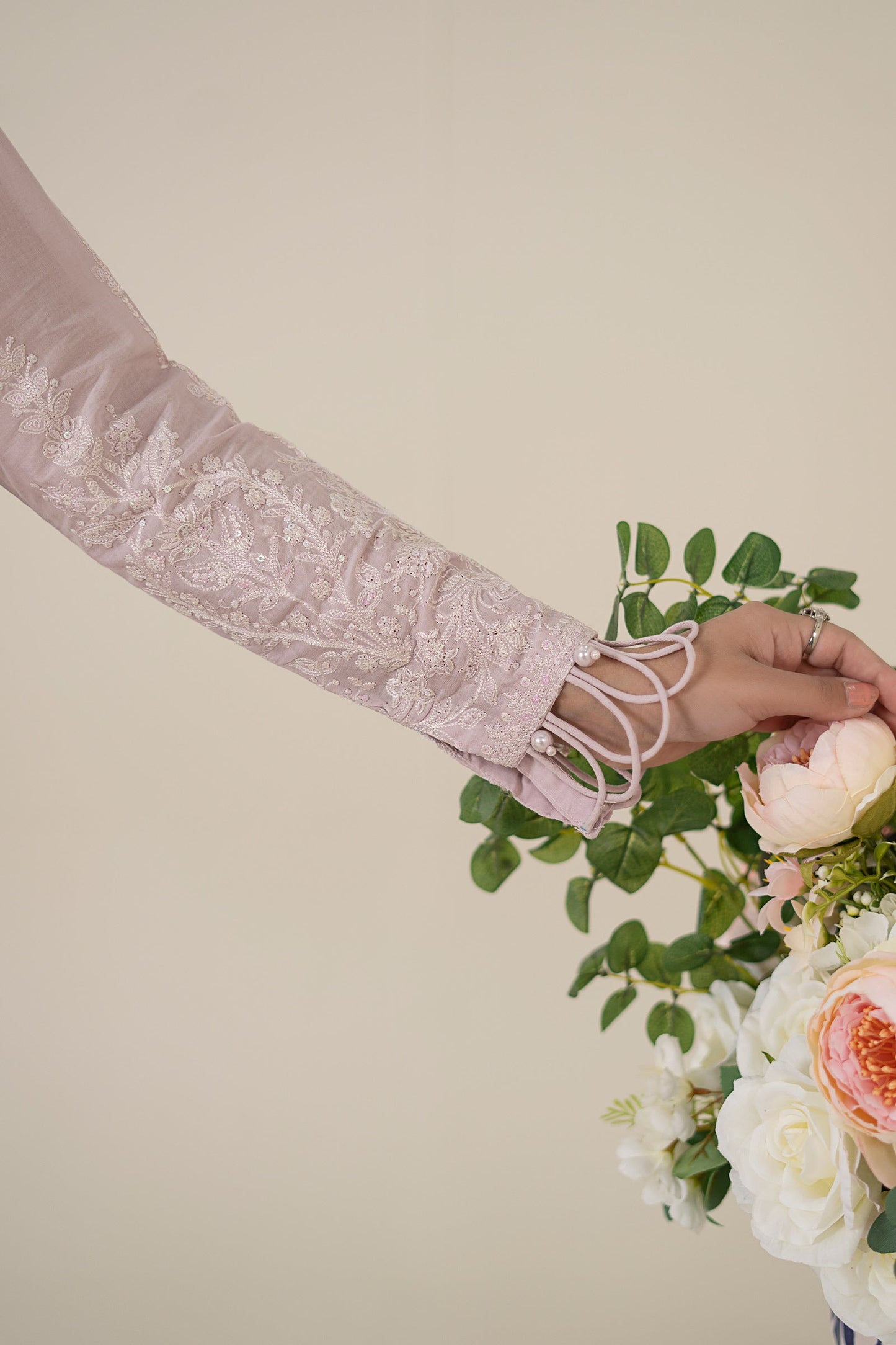 This Maria. B Luxury Pret 25 pink frock set is designed for elegance and festive charm. The lawn frock features a round neckline with loop button detailing, a boring embroidered front center panel, sequins embroidered front side panels, and lace detailing on the panels. Schiffli embroidered organza borders, full sleeves with fabric detailing, and pearl drop accents on the sleeves add sophistication. The dyed back ensures a seamless finish. Paired with a dyed cambric straight trouser with an elasticated waistband and a dyed poly organza dupatta with a four-side embroidered scalloped border, this ensemble is perfect for festive gatherings and special occasions.