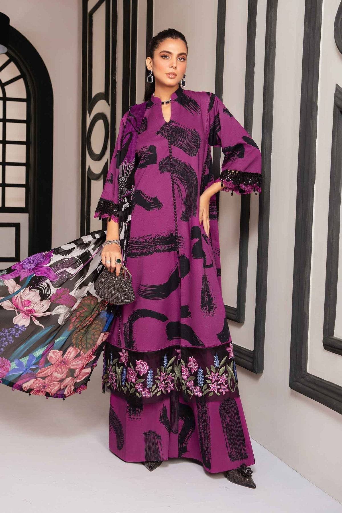 Rich and elegant, this Maria. B purple outfit from the M Print Eid Edit Collection features a printed lawn shirt accentuated with embroidered organza pattis I & II. The printed cambric trouser and luxurious printed silk dupatta complete the ensemble, creating a perfect balance of festive charm and sophistication for Eid and special gatherings.