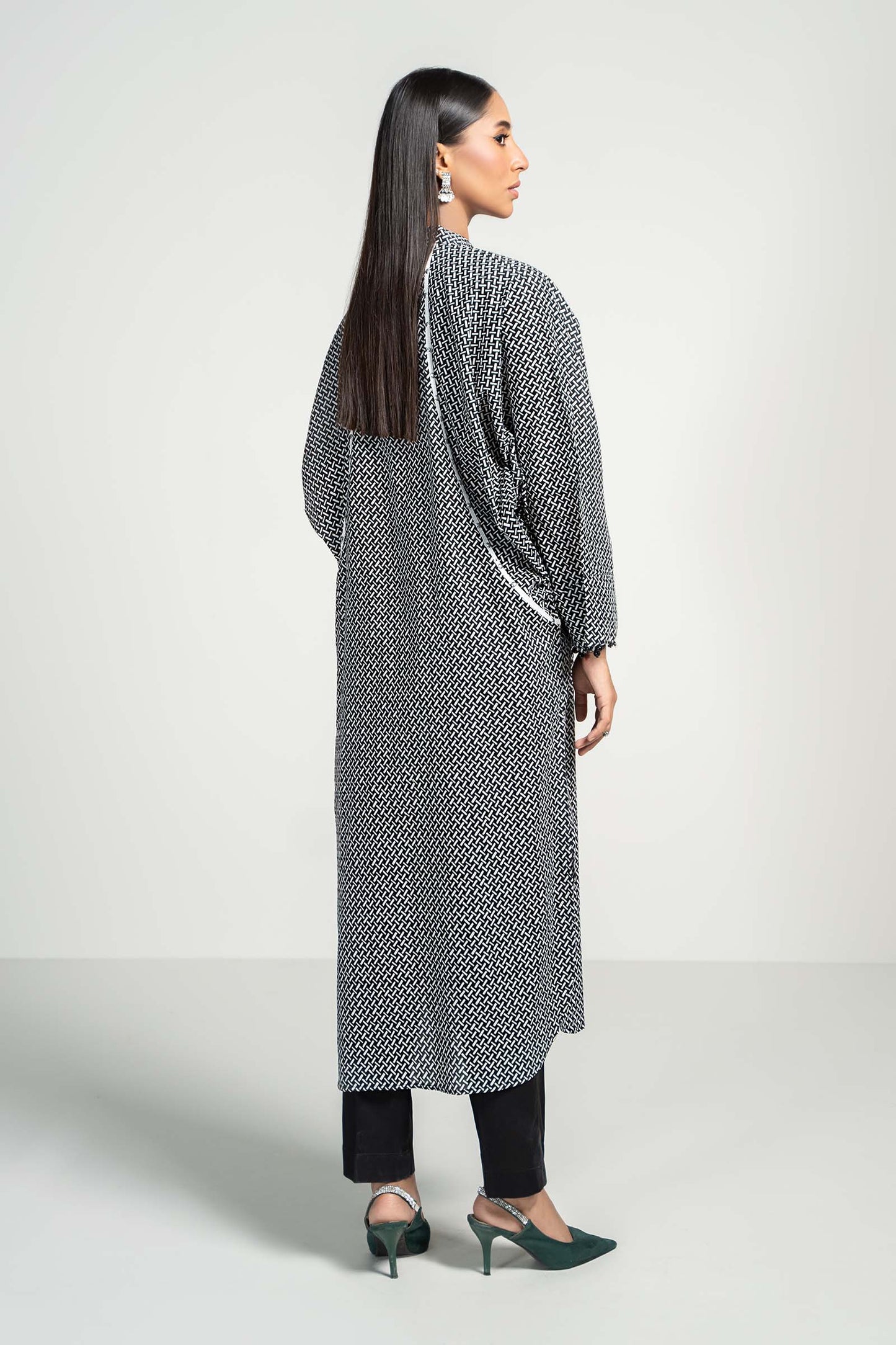 A stylish two-piece ready-to-wear set featuring a digitally printed lawn baggy shirt with a ban collar neckline and trendy high-low hem. The shirt is elevated with stud detailing on the front, back, and sleeves, offering a modern twist to everyday wear. Paired with dyed cambric straight trousers designed with an elasticated waistband for comfort and ease, this ensemble blends fashion and practicality, making it a go-to choice for casual and semi-formal occasions.