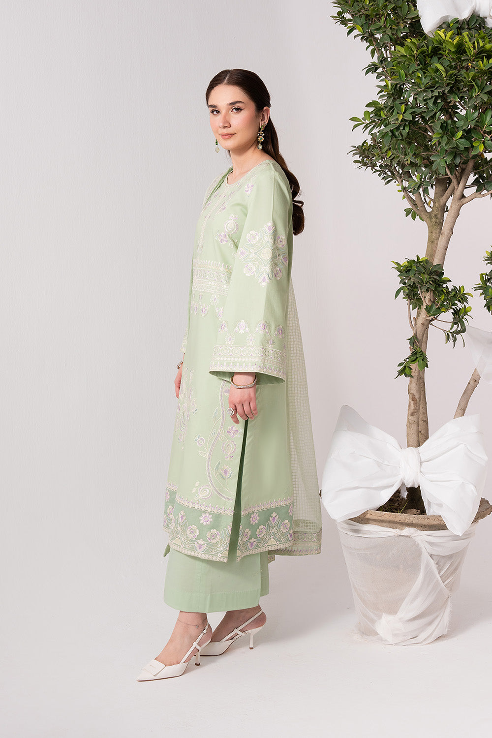 Step into refined elegance with this 3-piece pret set in Pale Green. The shirt, crafted from lawn, organza, and cotton, offers a graceful silhouette, complemented by a delicate check organza dupatta. Paired with cotton trousers, this ensemble exudes effortless sophistication.
