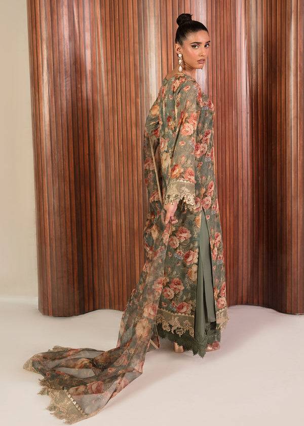 Breathe elegance into your festive wardrobe with Kamal, a dusty green printed chiffon ensemble layered over a soft dyed inner. The outfit features an organza printed dupatta finished with delicate zari lace, paired with refined raw silk trousers. Detailed embroidery on the neckline, sleeves, and daman adds timeless sophistication, making it perfect for formal gatherings and festive celebrations.