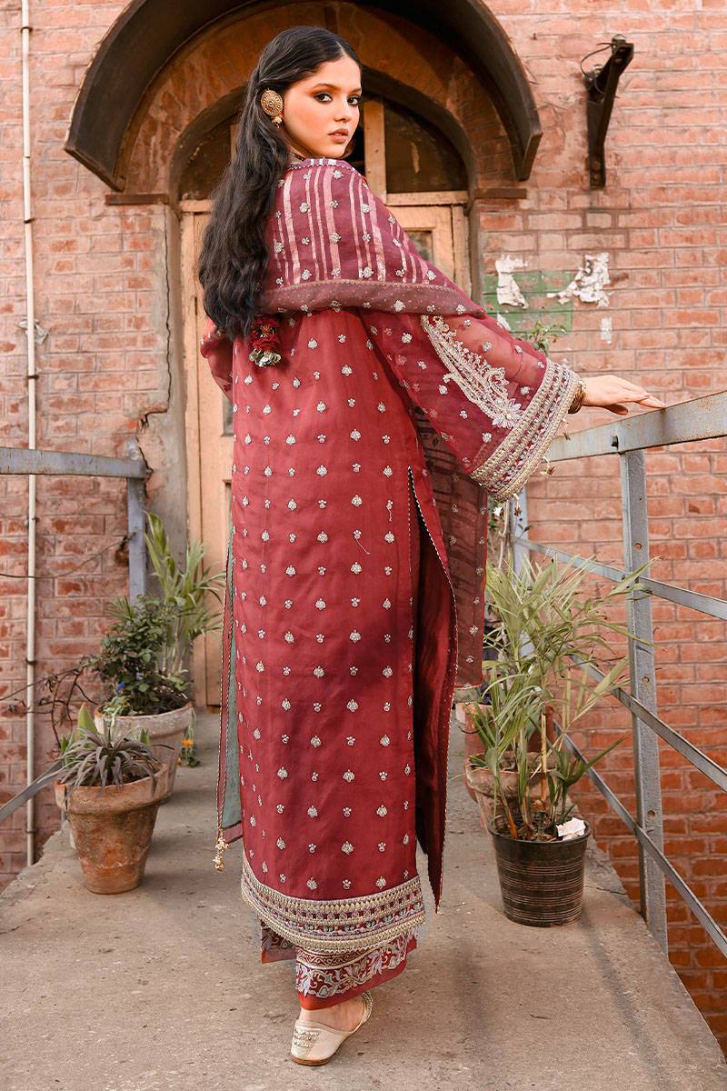 Rehmat is a maroon-red shirt crafted in delicate organza and adorned with intricate adda work. Garlands, peacocks, and paisleys grace the front, meeting a scalloped hemline accented with delicate embroidery, metallic touches, and trims. The light organza dupatta in shades of pink, red, and green features traditional booti motifs with kacha tila and metallic block print, finished elegantly with decorative trims. Paired with Italian silk trousers showcasing exquisite block-printed designs, this ensemble is a sublime choice for Eid festivities and celebratory occasions.
