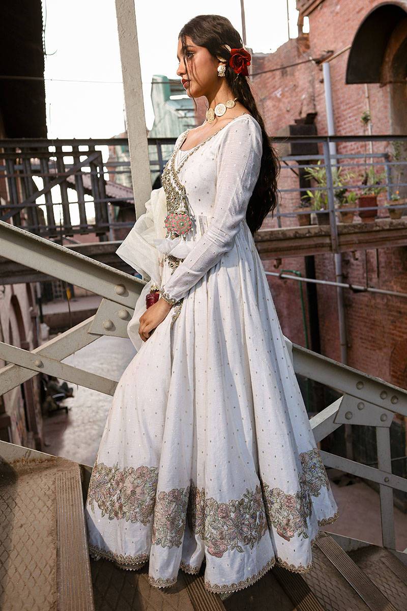 Rukhsar Begum is a sea shell white pishwas in an elegant angarkha style, crafted delicately from cotton net. Metallic bindis and embroidered motifs enhanced with heavy zardozi work lend an ethereal charm to the ensemble. The skirt features an embroidered floral border with tila thread finish, while the khadi net organza dupatta is adorned with gold and pink block-printed floral designs, accented with subtle glittering details. Paired with Russian silk choori daar pajama featuring borders and kinari, this outfit embodies timeless elegance, perfect for Eid celebrations and festive occasions.
