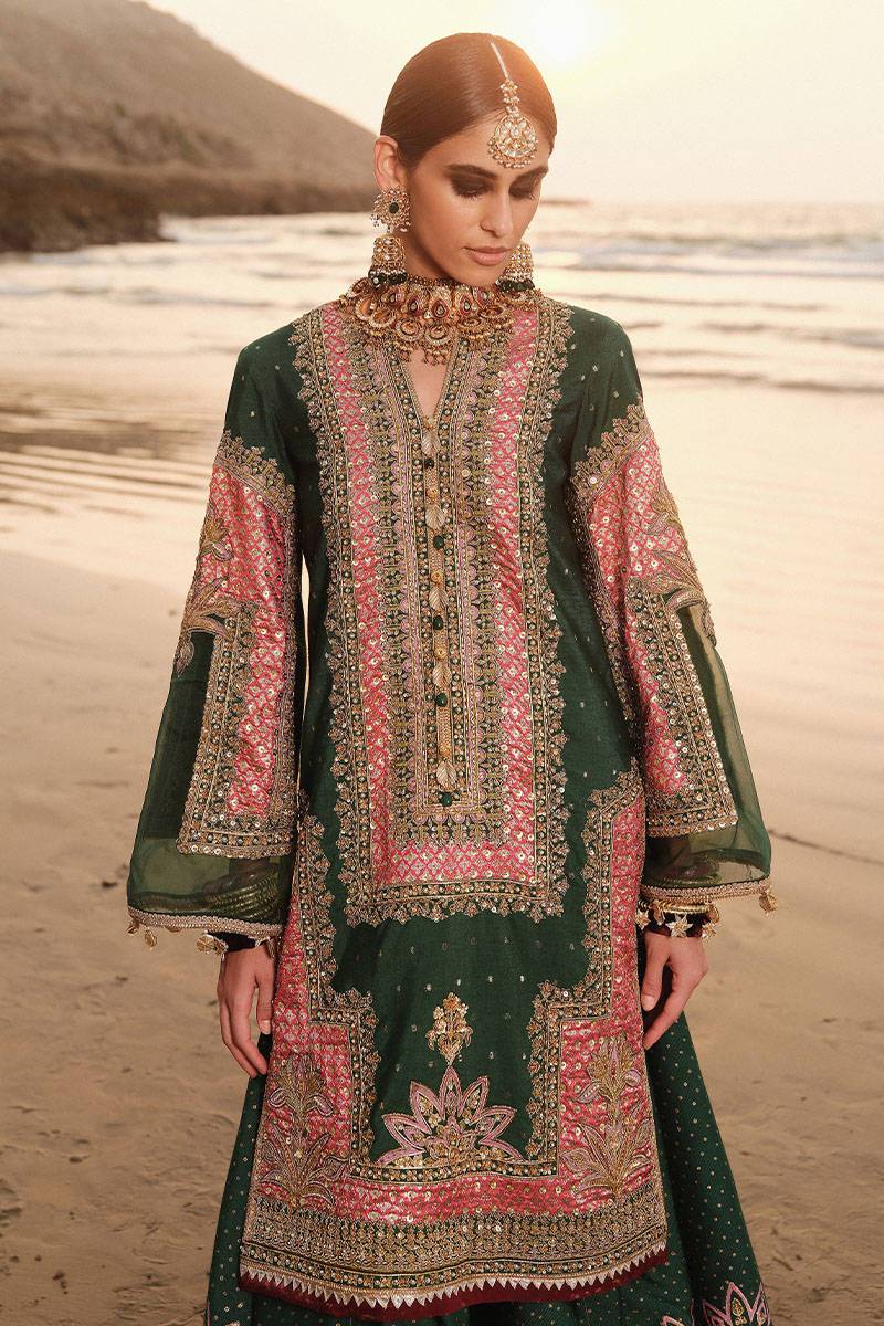 Indulge in the enchanting allure of Nerissa, a bridal ensemble that radiates timeless elegance. The cotton net shirt in a shade of paan green, adorned with intricate kacha tila appliqué and block print, is a masterpiece of artistry. Enhanced by meticulous embroidery and adda work, it embodies heritage and grace. The ethereal organza dupatta, featuring block print and ari cut work, adds a delicate, ethereal touch. Completing the ensemble, the cotton net sharara is graced with Italian silk patching, block print, and exquisite trims. Nerissa is a harmonious symphony of tradition and contemporary charm, perfect for the discerning bride.