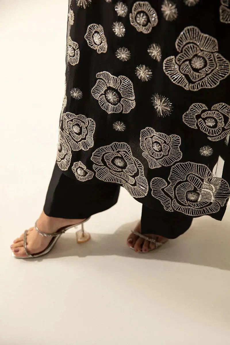 "Manera," in the timeless allure of Black, captivates with its sophistication and modern glamour. This stunning outfit is meticulously adorned with a striking combination of chains, cut dana embroidery, crystals, and Swarovski elements, creating an ensemble that is both chic and opulent.