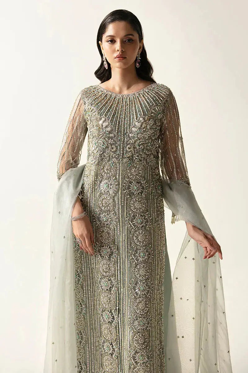 Meline, crafted from delicate net fabric, is adorned with a meticulous arrangement of pearls, crystals, dabka embroidery, moti beads, and modern pipe detailing. The delicate interplay of these elements on the sheer net canvas creates a mesmerizing visual tapestry, perfect for making a graceful statement at any festive occasion.