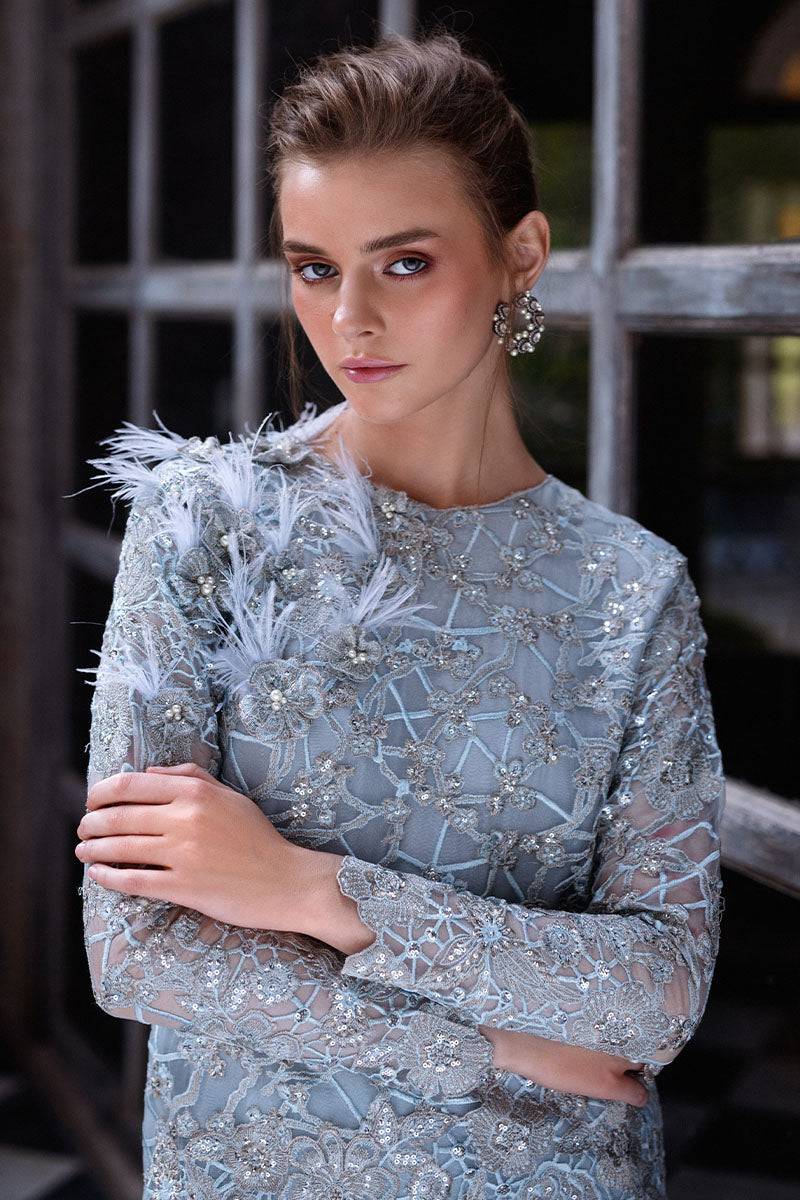 At the heart of Lumen is a resham embroidered organza shirt, meticulously crafted to elevate your style with intricate detailing. The shirt is adorned with delicate pearl embellishments, 3D floral appliqués, and luxurious fur accents on the shoulders, exuding timeless beauty and sophistication. Paired with sleek plain raw silk straight pants, this ensemble offers a classic silhouette, perfect for formal events and special occasions.