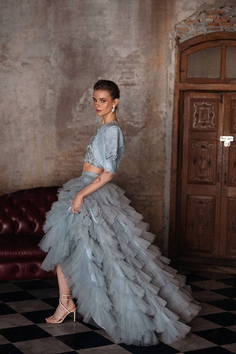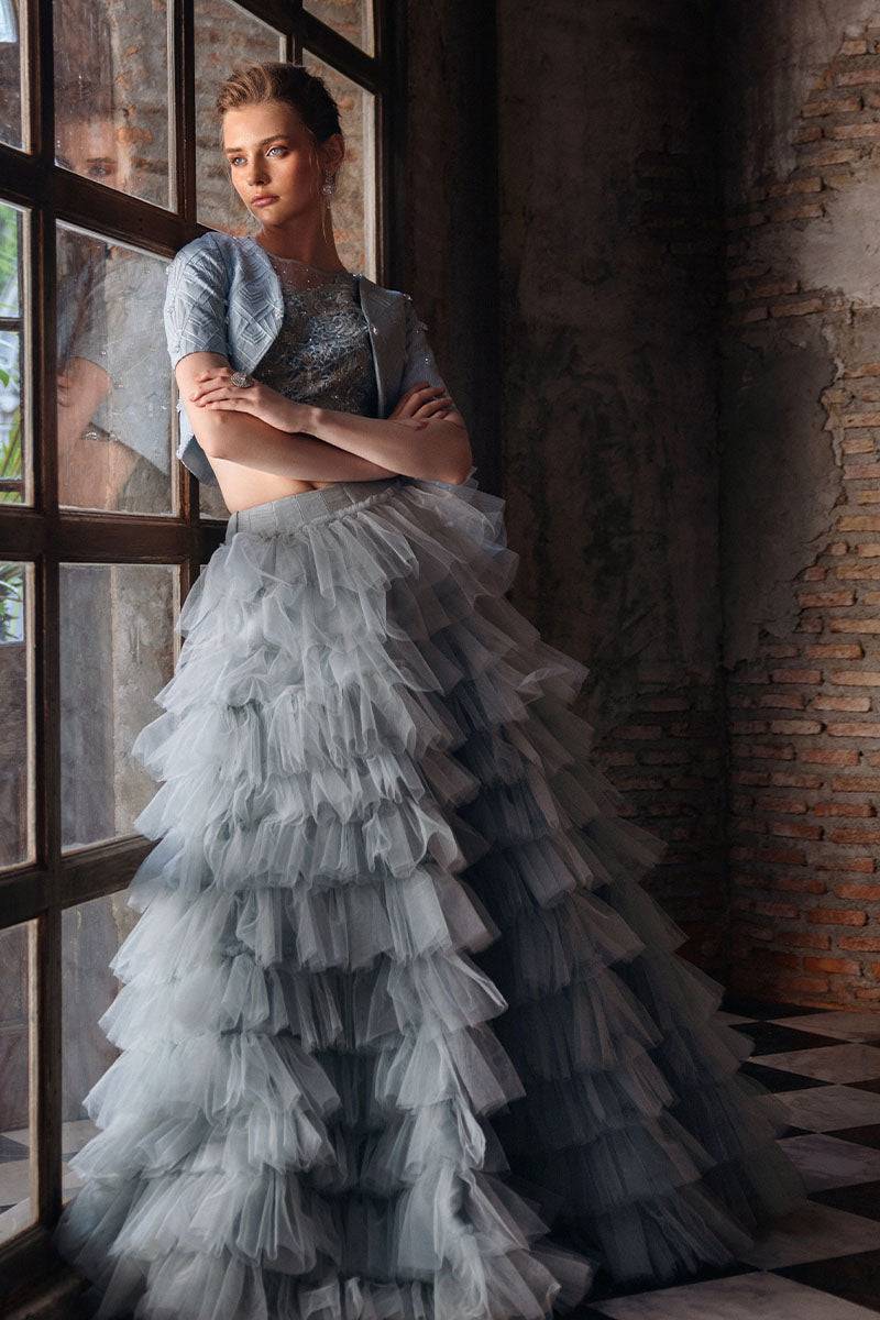 Satori in cloud blue is a harmonious blend of elegance and artistry. The organza blouse is adorned with exquisite Resham embroidery and subtle sequin embellishments, exuding a soft shimmer of sophistication. Complementing the blouse, the half-sleeves jacket is intricately embroidered and features delicate crystal hangings that dance with every movement, creating a captivating visual effect. The ensemble is completed with a luxurious raw silk skirt, enhanced with net ruffles that add whimsical charm and fluidity, making Satori perfect for special occasions where elegance and grace take center stage.