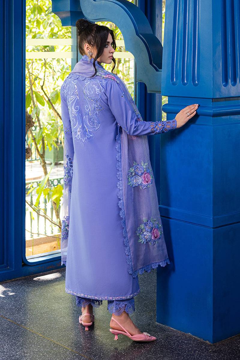 Experience timeless elegance with this stunning blue lawn ensemble from Mushq’s Orient Express Luxury Lawn collection. The shirt features exquisite chikan embroidery on the front, paired with embroidered and sequinned back and sleeves for a harmonious, luxurious finish. Delicate organza lace and embroidered 3D flowers elevate the overall aesthetic, while the embroidered and sequinned organza net dupatta adds a graceful, ethereal touch. Completing the ensemble are dyed cotton trousers with crochet lace and nakshi ball detailing for the front border, making this outfit perfect for festive occasions.