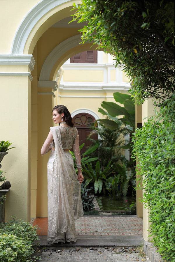 The Mysie by Tahira line is a stunning three-piece printed net sari that exudes beauty and grace. The sari is a lovely white color, with elegant embroidery that lends a sense of regal beauty. Intricate beading and sequin work flow gracefully across the sheer net fabric, producing a captivating impression with each movement. This sari combination is ideal for formal occasions, with a matching embroidered blouse and an embellished net dupatta, each item complementing the other to create a harmonious and rich look.