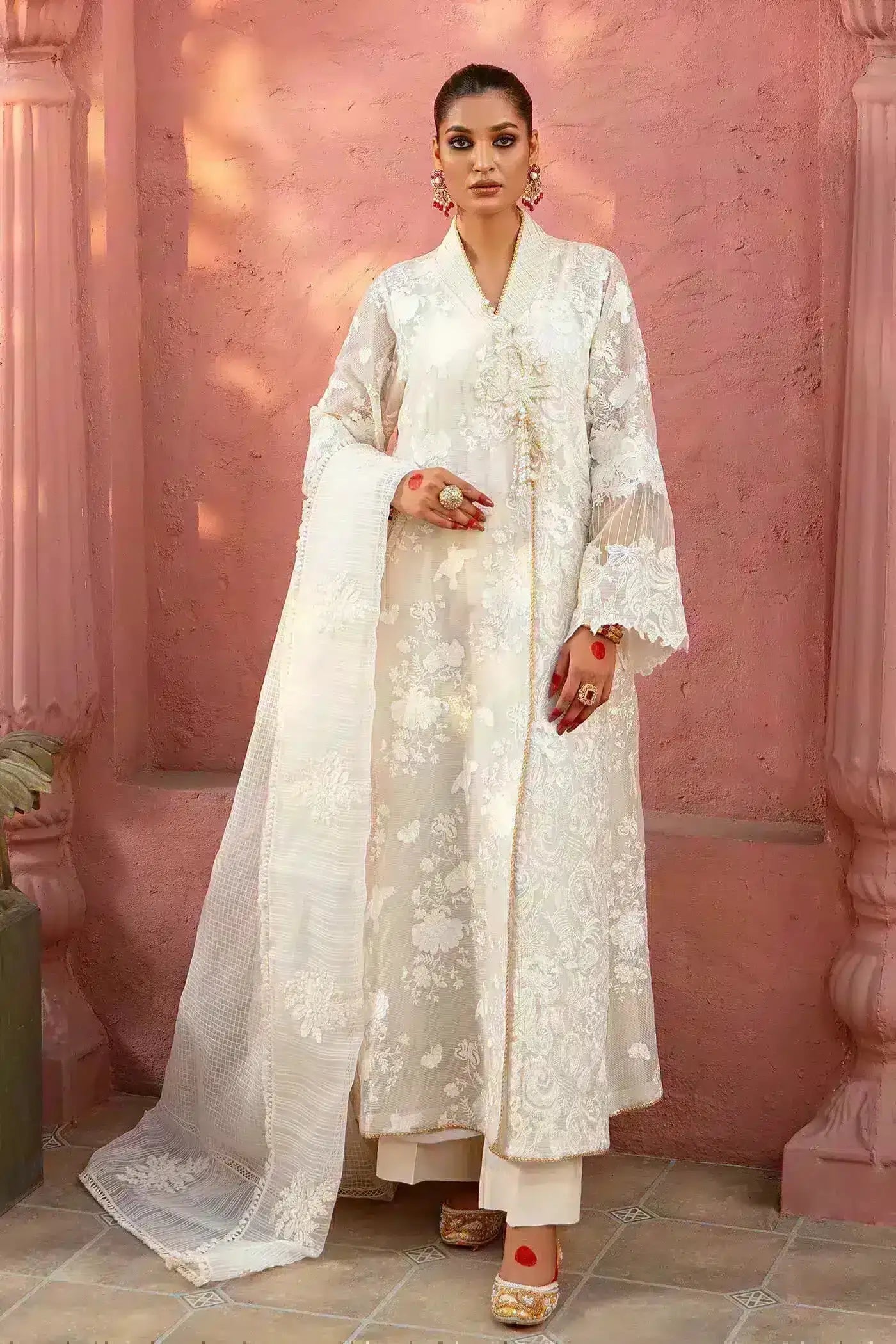 Nilofer Shahid created this lovely angrakha evoking exceptional grace and beauty with braid details and a center embellished motif. Pair it with classy pants and the signature NS self-organza dupatta with intricate work to add allure to the ensemble.