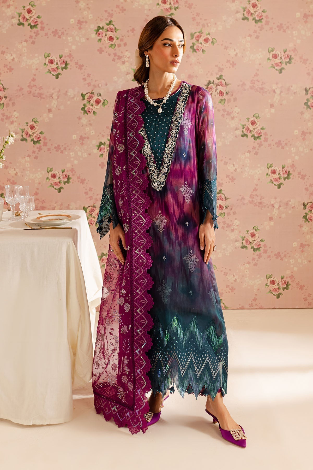 Radiate elegance with this Nureh formal design crafted in chiffon and organza. The outfit features an embroidered and embellished chiffon shirt, paired with a finely embroidered organza dupatta that adds sophistication to the look. A dyed raw silk trouser with a matching inner completes the ensemble, offering the perfect blend of luxury and tradition for weddings, festive occasions, and formal gatherings.