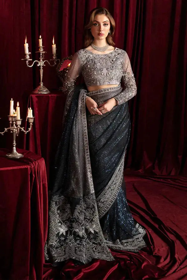 A glamorous ensemble featuring an embroidered net shirt adorned with twin sequins on the front and back, hand-work embellishments on the front body and sleeves, layered silk daman borders, and a plain dyed resham silk inner. The set includes an embroidered net twin sequins dupatta with silk borders and an organza pallu patch, paired with a plain dyed raw silk trouser. Perfect for festive occasions or semi-formal gatherings, this outfit combines sparkling handwork with luxurious fabrics for an elegant and sophisticated look.