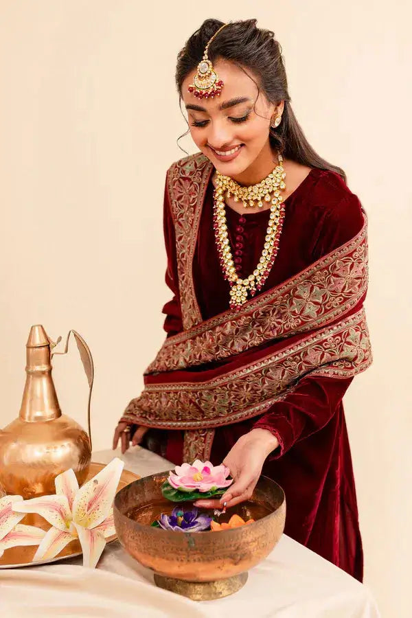 A luxurious 3-piece ready-to-wear ensemble featuring a raw silk shirt paired with matching raw silk trousers and an embroidered woolen shawl. Perfect for winter weddings, festive occasions, or semi-formal gatherings, this set combines rich fabrics with intricate embroidery for a refined and elegant look.