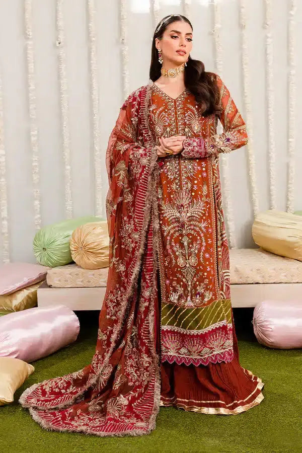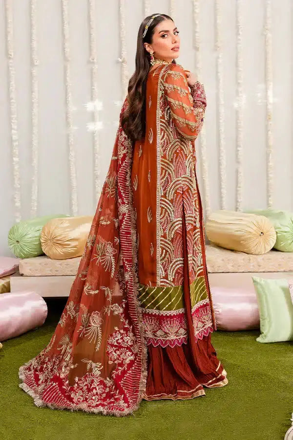 A graceful ensemble featuring an embroidered chiffon shirt with hand-work embellishments on panels, paired with an embroidered chiffon dupatta with a contrasting four-sided border. The set includes a plain dyed raw silk crushed trouser adorned with gota lace on the borders and a plain dyed silk inner. Perfect for weddings and festive occasions, this outfit combines intricate embroidery and luxurious fabrics for an elegant and sophisticated look.