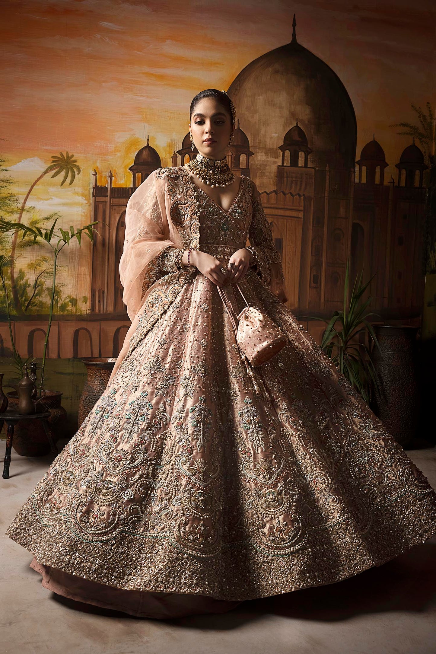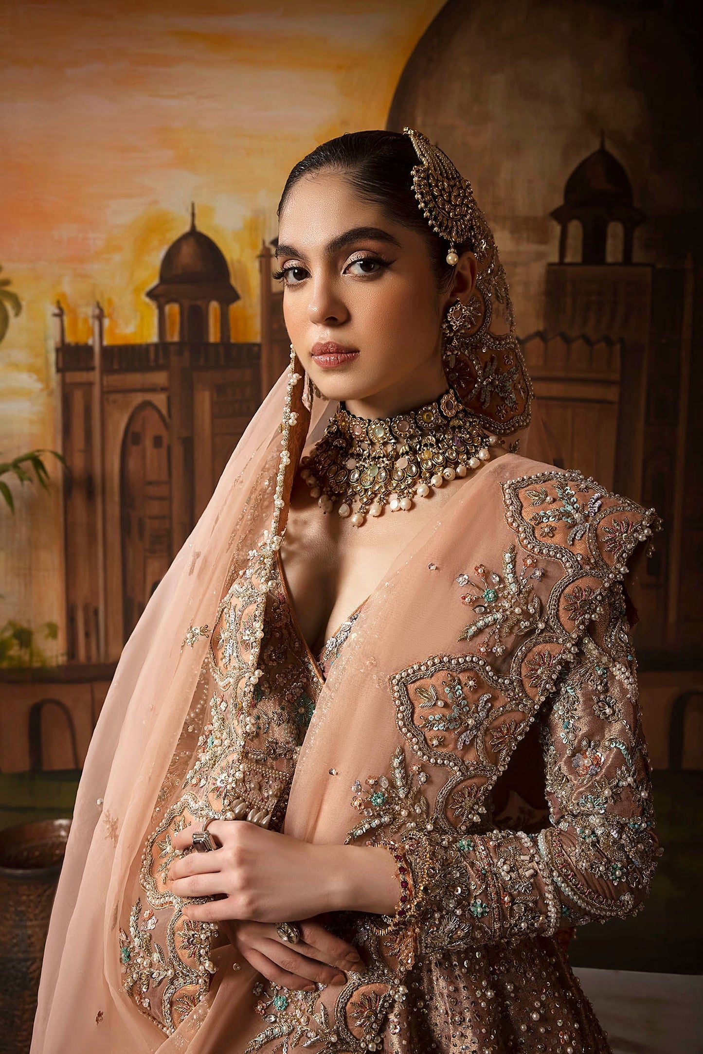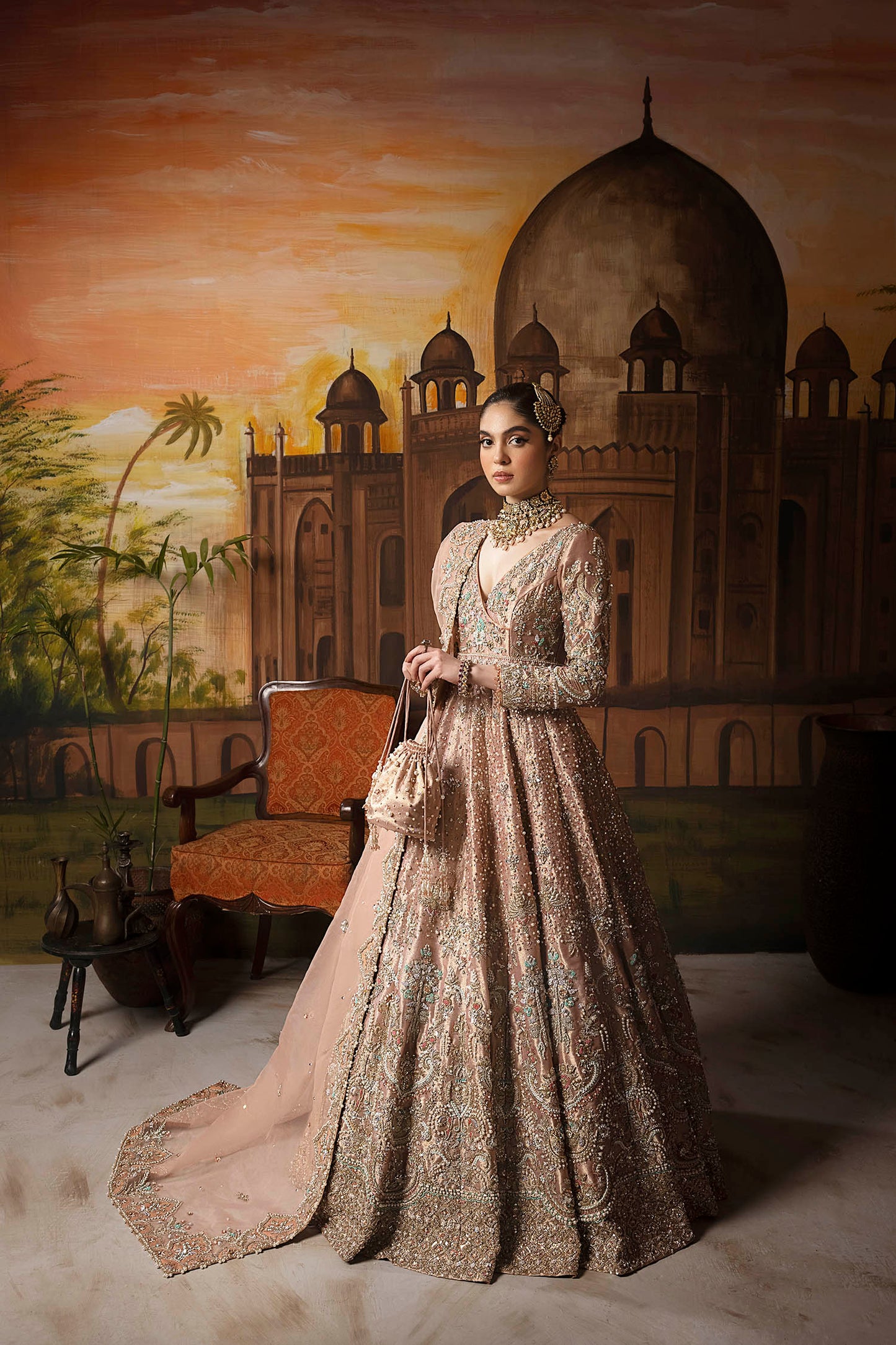 Float your way through the wedding season in ethereal bliss in 'Iris'. A classic floor length tissue pishwas silhoutte is heavily hand embelished with pearls and crystals, indigenous naqshi and dabka embroideries making the sprawling artwork come to life with resham work in shades of aqua and pearl pink. Layered with a lavish organza dupatta fully frosted with intricate hand embelishments luxuriously framed with detailed borders, this grand design would help you make an opulent statement on your big day.