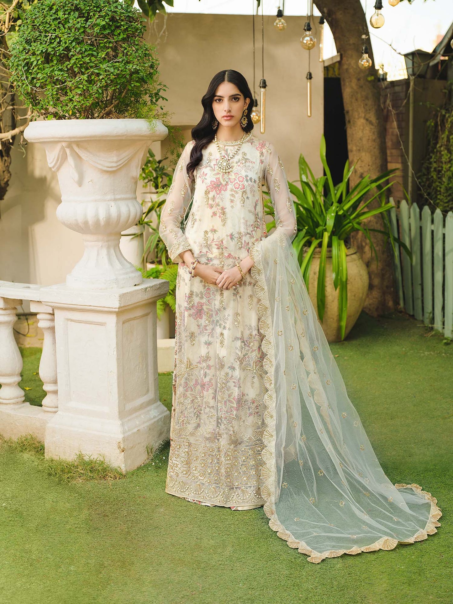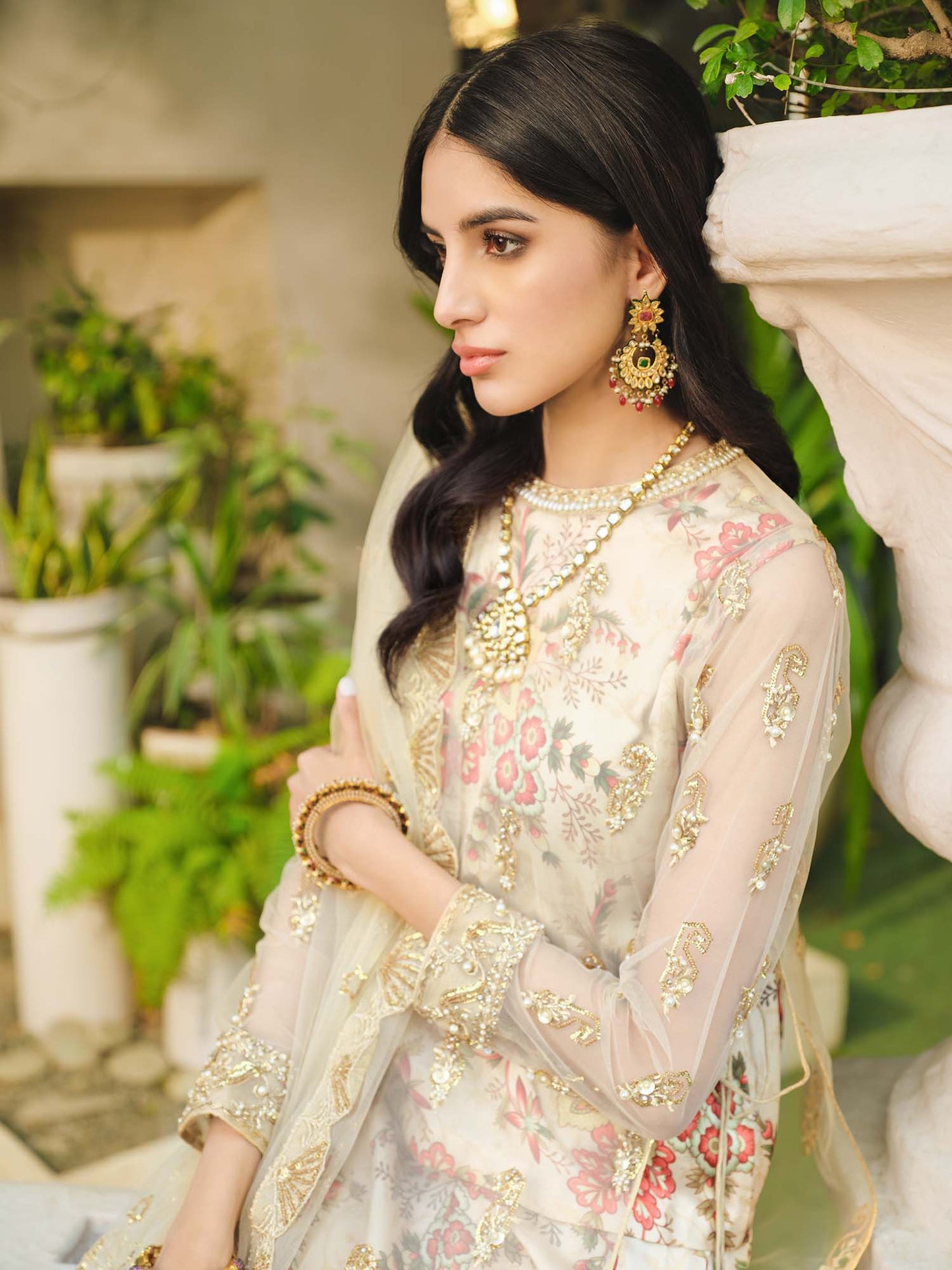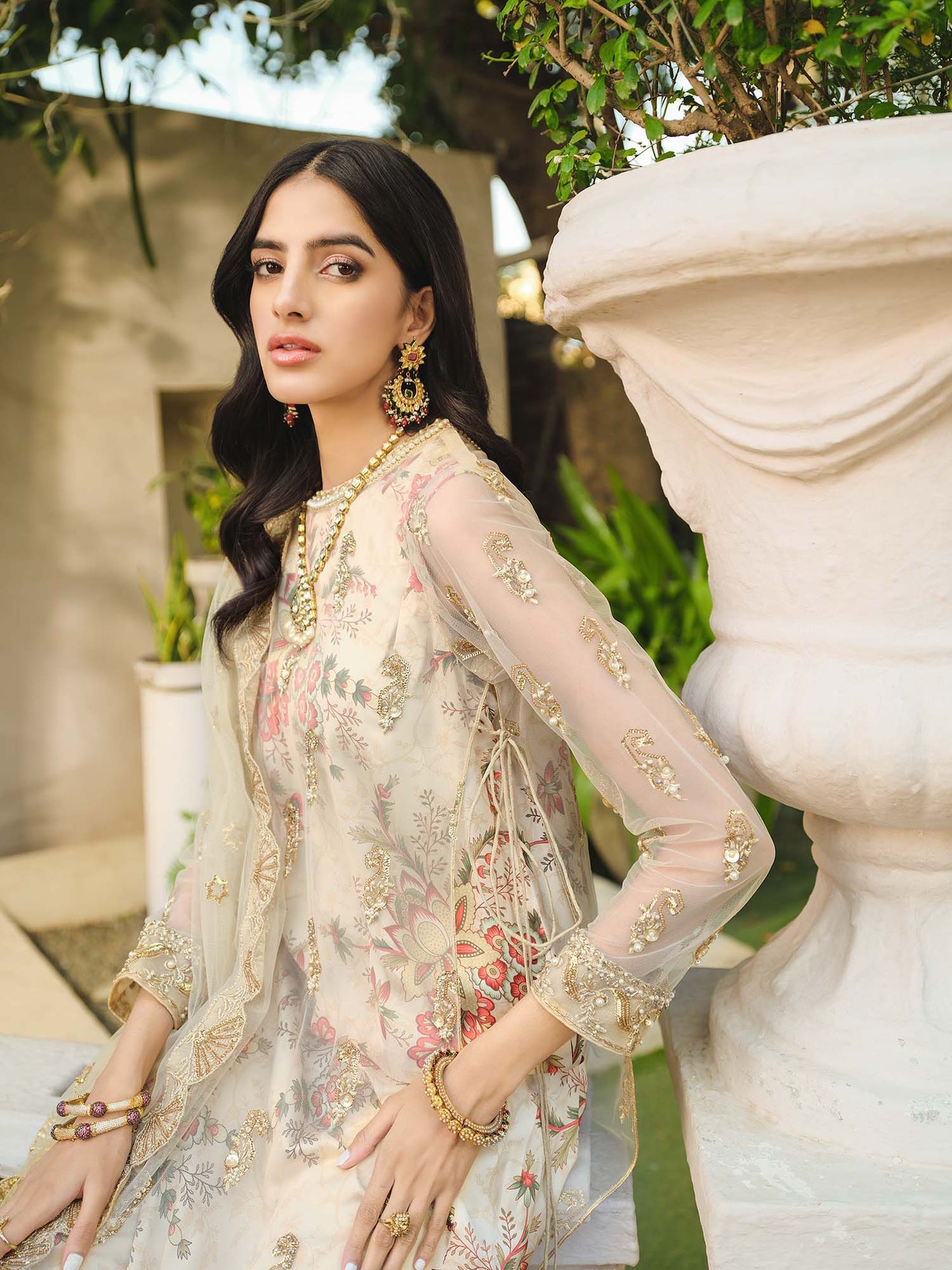 Digital Printed Inner Silk shirt trousers with embroidered net long shirt. Embroidery with Tilla and heavy hand embellished / Adda work with naqshi, dabka and pearls.