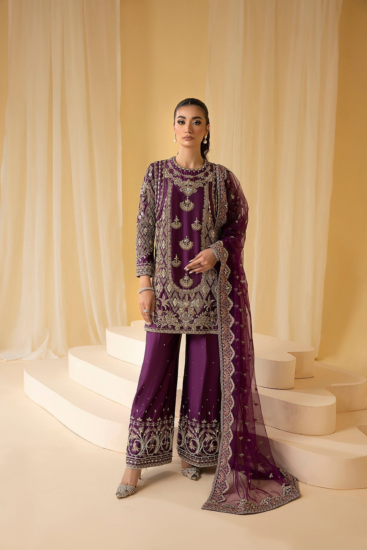 A vibrant mulbery purple is offset to a sumptuous composition, 'Haze' features a graceful shirt adorned with intricate thread work beautifully crafted floral motifs with hand embellishments using naqshi, dabka, pearls and crystals. This gorgeous shirt is paired with a classically flared embroidered trouser and a stunning dupatta. Make an impact at festive occasions in this timelessly classic piece.