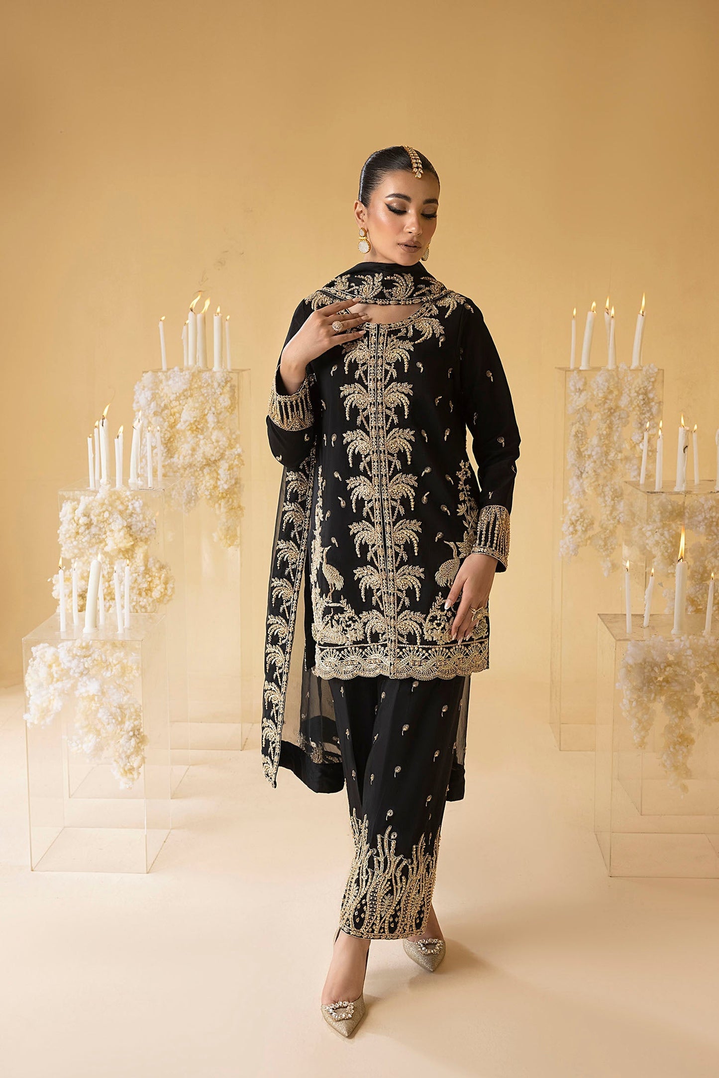 'Jade' emulate your inner diva with this resplendent midnight black shirt, enriched with intricate floral and scenery patterns meticulously incorporated on the front open silhouette and are expertly infused into the garment by an array of handcrafting techniques utilizing dabka, naqshi, pearls and baithki illustrating exceptional artistry. When combined with complementing fine raw silk trousers and a mesmerizing organza dupatta adorned with embroidered borders, this stunning ensemble depicts the true esscence of femininity and grace.