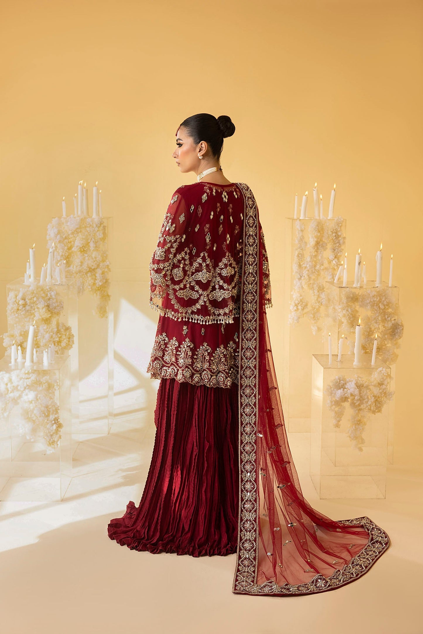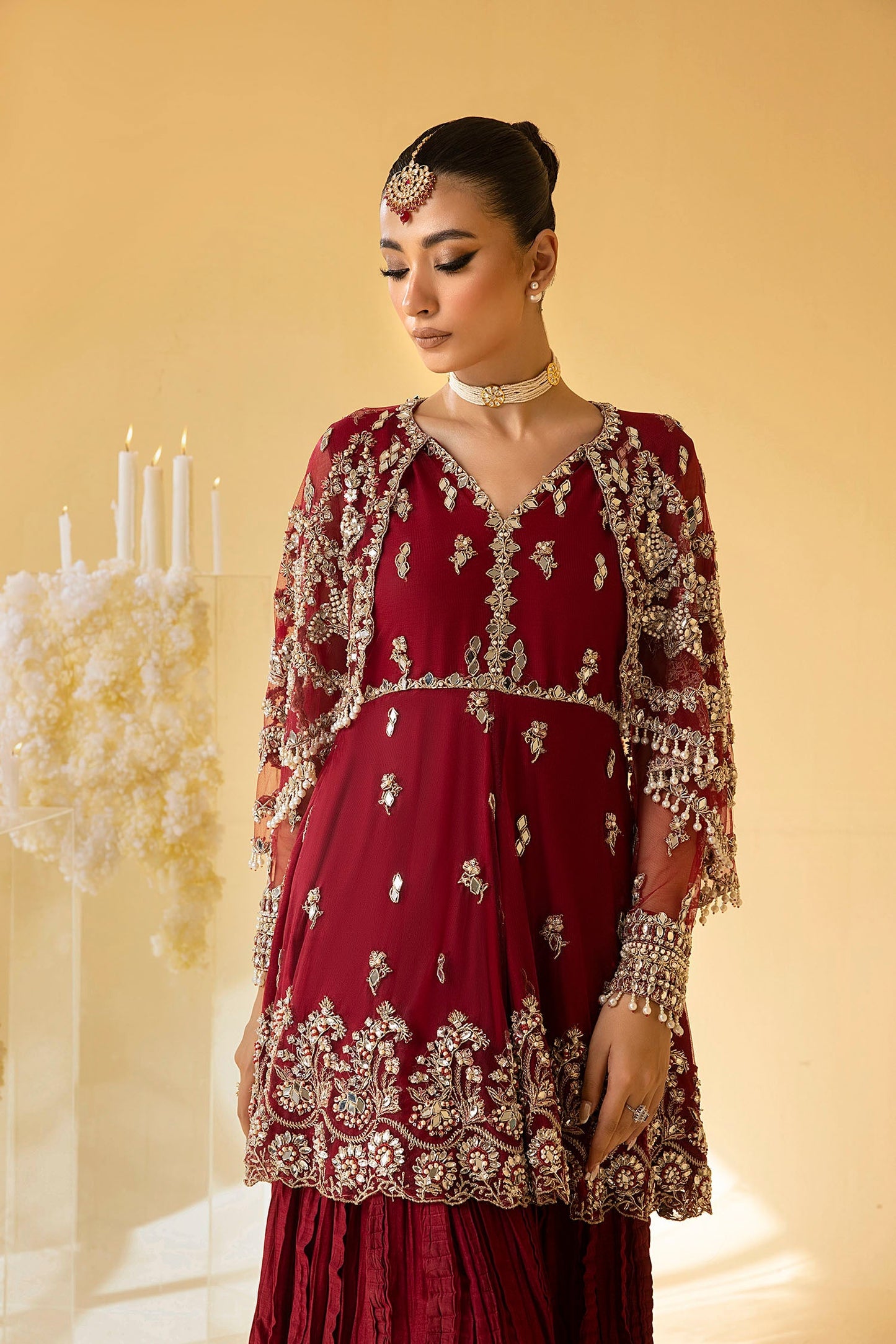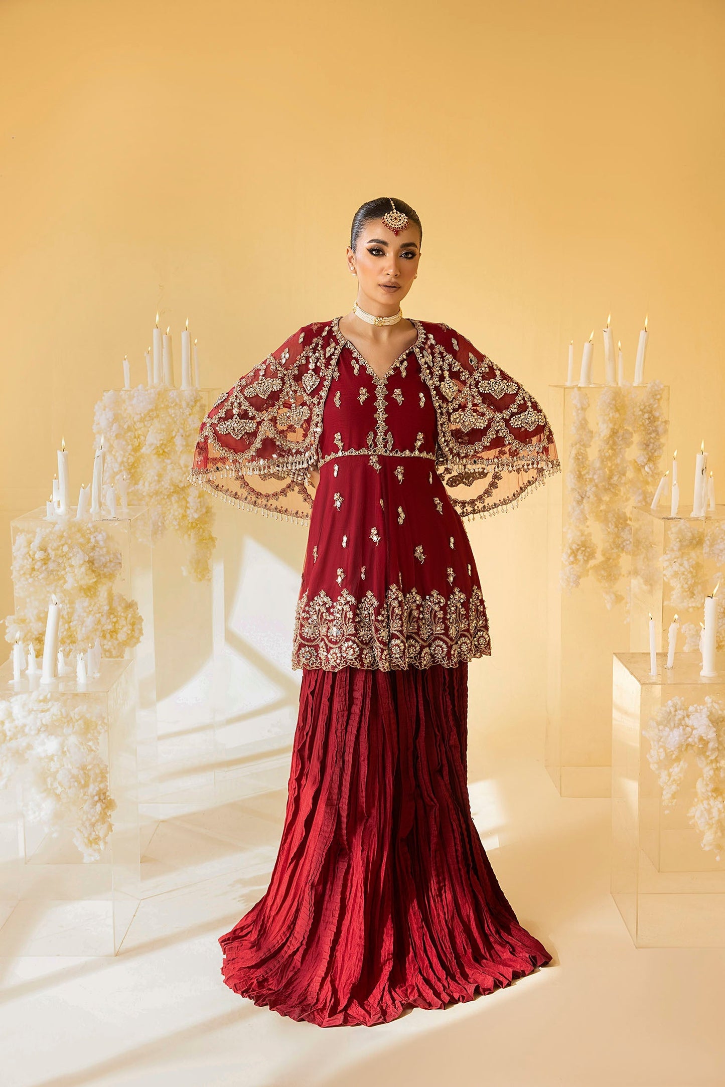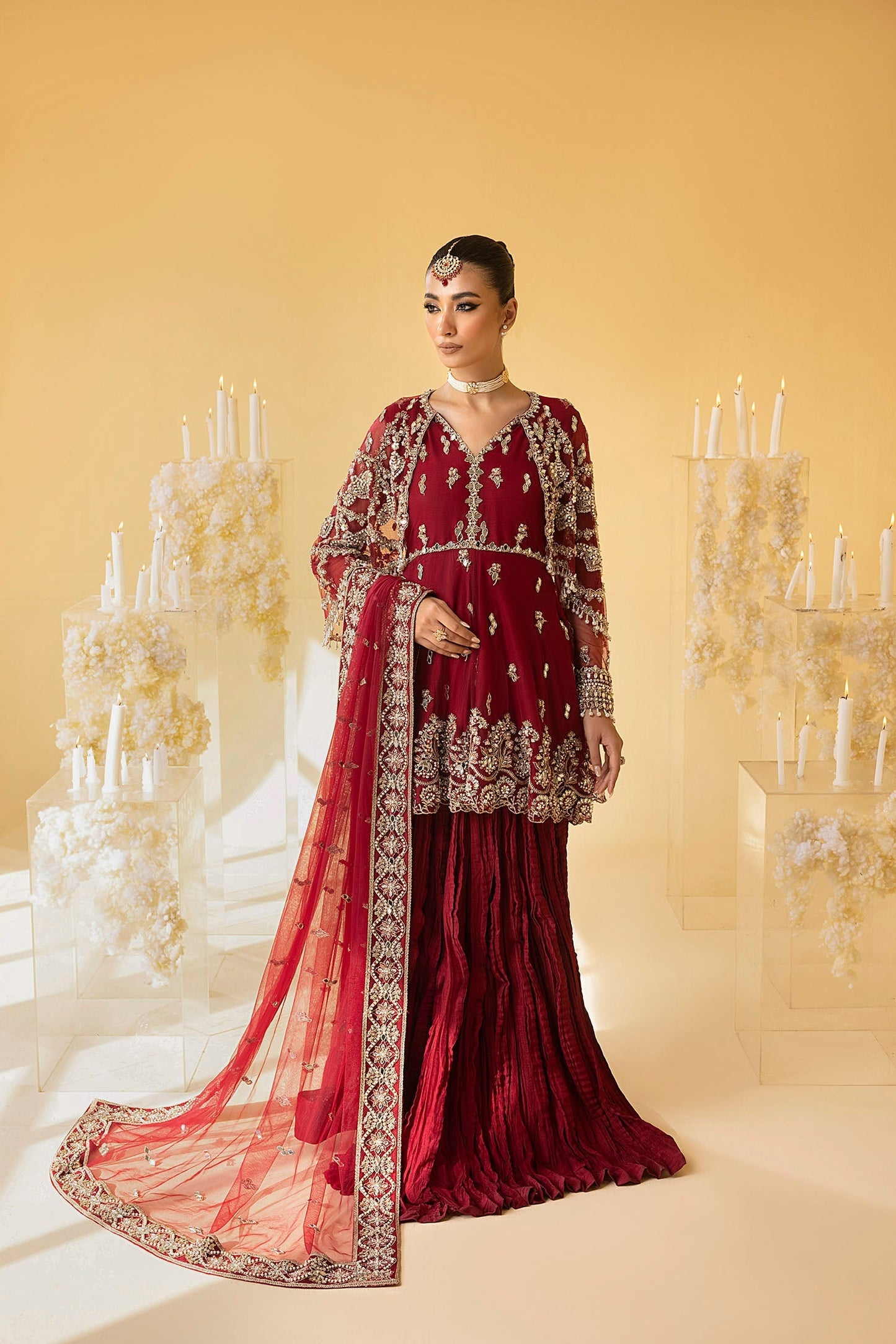 'Scarlet', behold the craftsmanship of this exquisite ensemble - a stunning barn red flared net and cotton silk peplum shirt adorned with intricate floral motifs and a scalloped edgy border, embellished with mirror work, naqshi, dabka, pearls and crystals for a truly enchanting flow. Diligently hand crafted with meticulous care and adorned with intricate detailing, the modern look is complimened with a beautiful cape that is a masterpiece of unparalleled beauty. Further enhanced with a crushed sharara and a classy net dupatta featuring floral embroidered borders, this gorgeous ensmble weaves a contemporary allure with classic design aesthetics to create a refined and celebratory appearance.