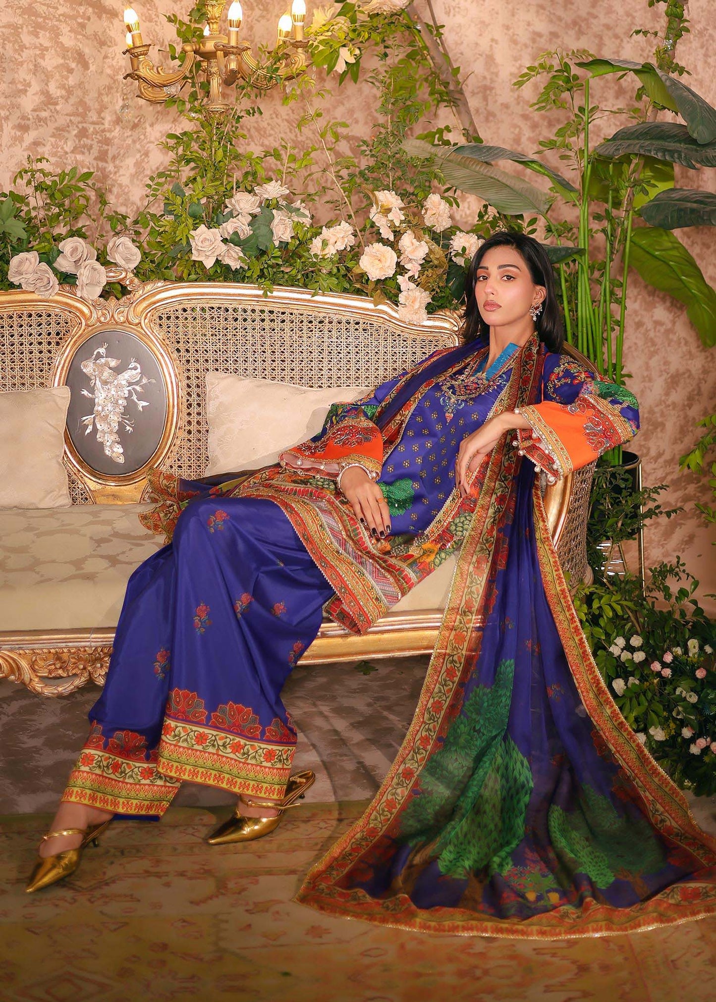 Grip Silk with sublimation print, elevated by intricate hand embellishments using Baithki, Nakshi, Sitara, Gota, Gota Balls and Lace.Includes: Shirt, Trouser Dupatta.
