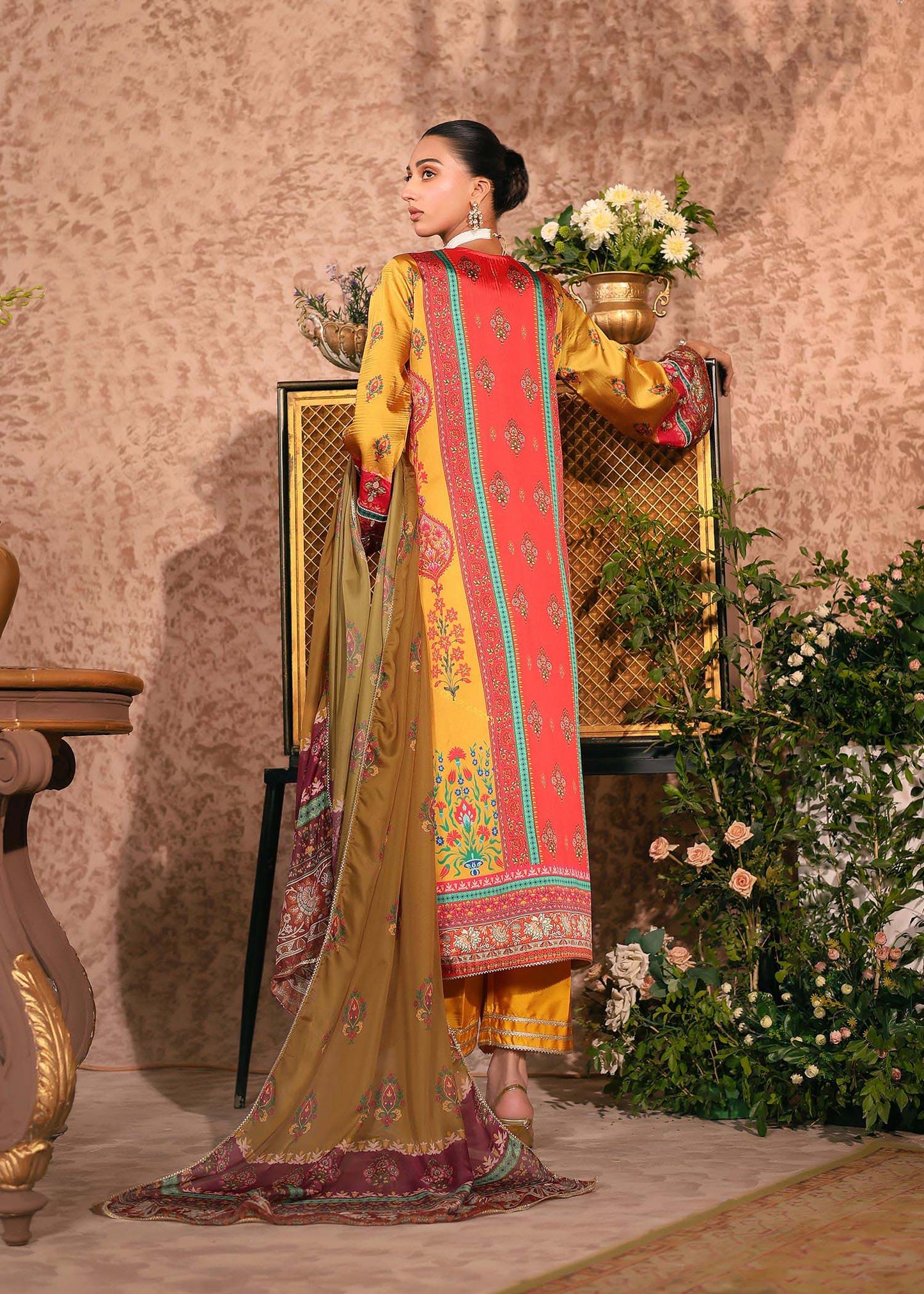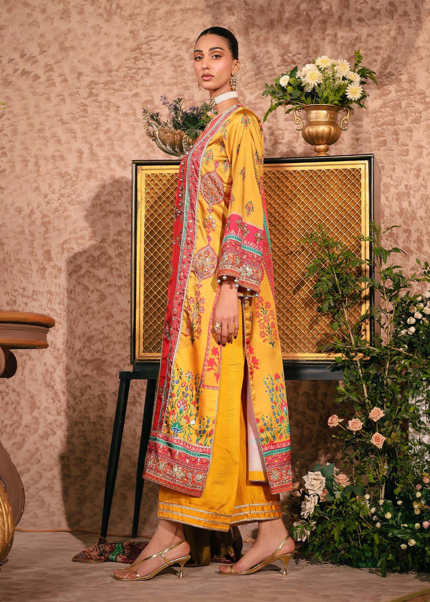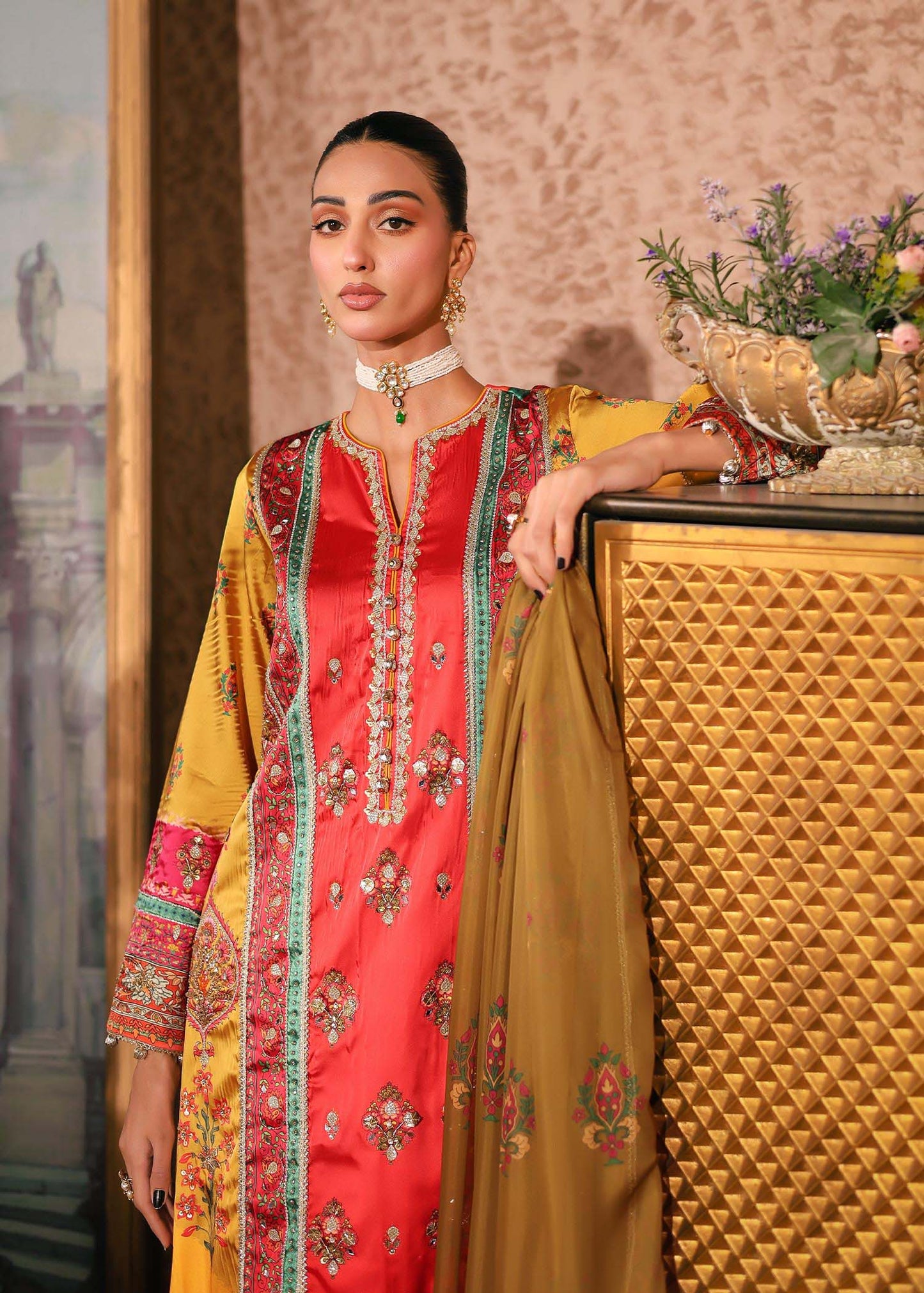 Fine Shamose Silk with sublimation print, elevated by intricate hand embellishments using Baithki, Cut Dana, Sitara, Mirror, Gota, Gota Balls and Multi chain and Lace.Includes: Shirt, Trouser Dupatta.