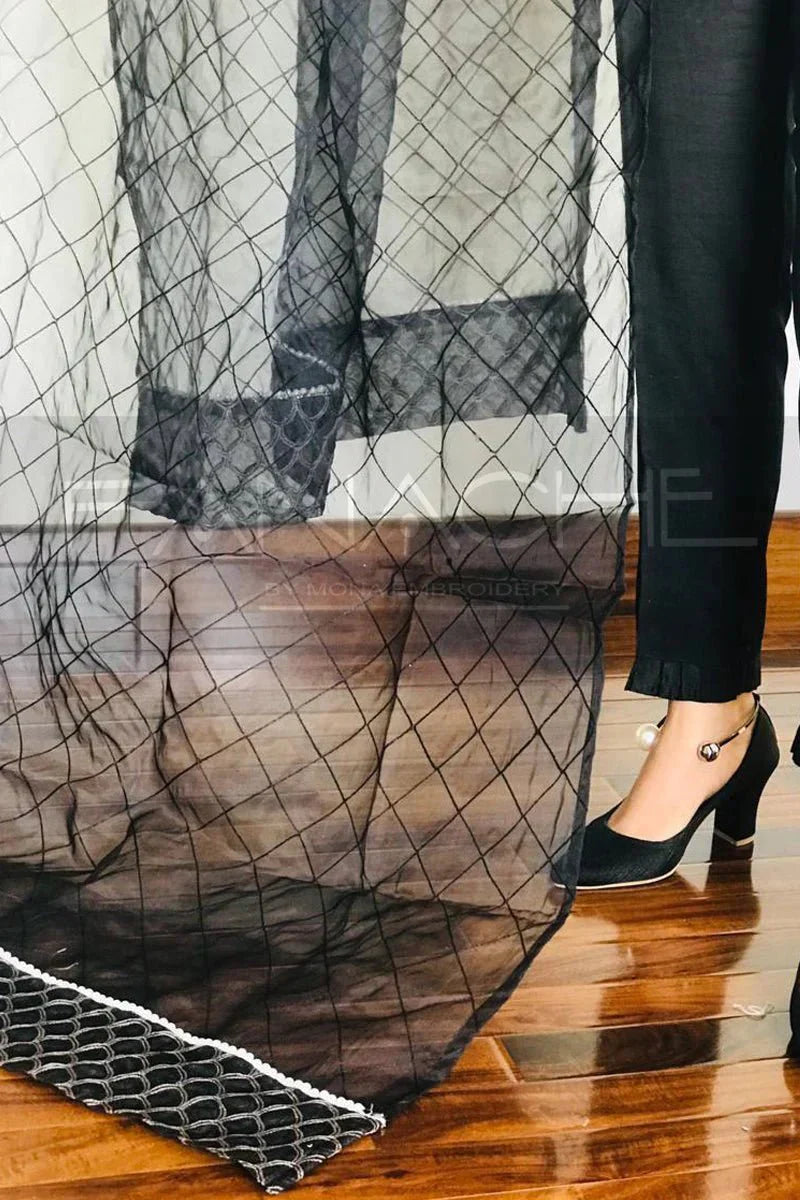 A long, panelled frock in pure black organza adorned with intricate embroidery €“ exquisite lacework on the sleeves, neck, panels daman.