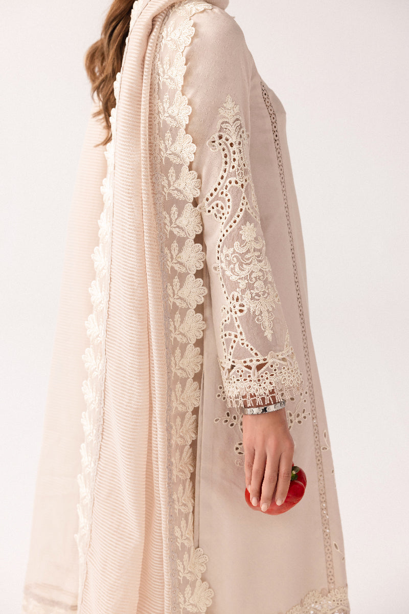 Ever seen a more elegant color? This stunning ivory ensemble, crafted in luxury jacquard weaved lawn fabric, features intricate embroidery that defines timeless sophistication. A perfect blend of basics and luxury, this outfit from the Ramadan collection is designed to make a memorable statement. Paired with a jacquard weaved dupatta and plain cotton trousers, it balances elegance and comfort seamlessly.