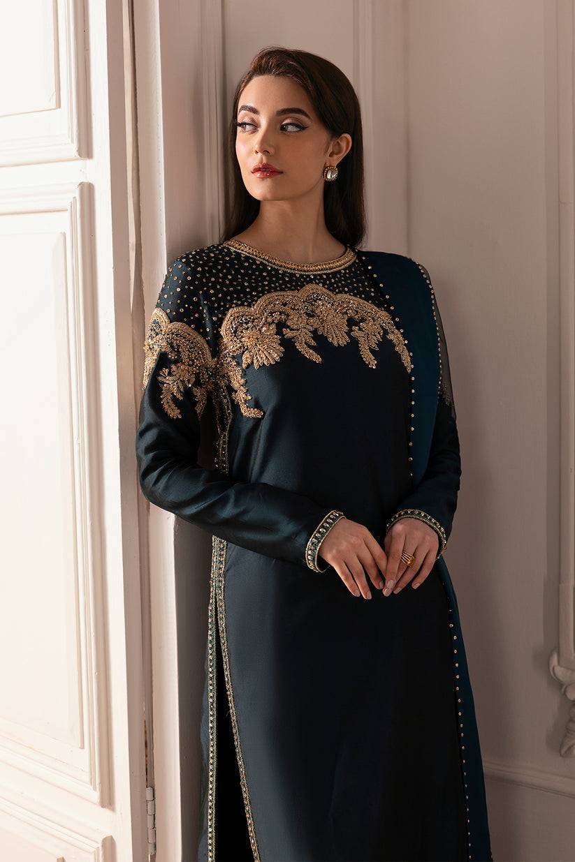 Elevate your elegance with this breathtaking embroidered straight shirt. Draped in the allure of zinc, the silk shirt is meticulously bejewelled with golden handwork that gracefully dances across the neckline, sleeves, slits, and borders - each detail a testament to impeccable craftsmanship. Accompanied by sleek cigarette pants, this ensemble encapsulates modern sophistication. It comes paired with a diaphanous organza dupatta, delicately adorned with a scintillating sequin spray, adding a bling to your look. This outfit is truly a vision of refined elegance.