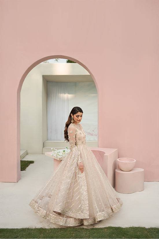 Featuring graciously crafted net pishwas in resplendent hues of salmon pink. Bedecked with opulent golden hand embellishments and intricate details of gotta lacing on panels, creating a celestial masterpiece. Paired harmoniously with a heavily embroidered net dupatta, ensuring an interplay of style and sophistication.
