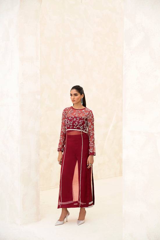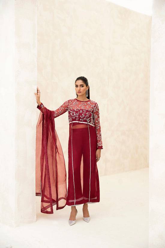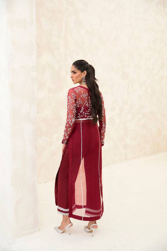 A fabulous maroon ankle-length shirt intricately embellished with silver sequin, cut dana, and naqshi on the front, back, sleeves, and sidelines that captivates the eye. It is paired gracefully with straight silk pants finished beautifully with a multihead border. The organza dupatta, with four-sided borders and sequin spray, enhances the overall charm of the outfit.