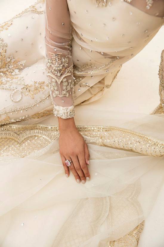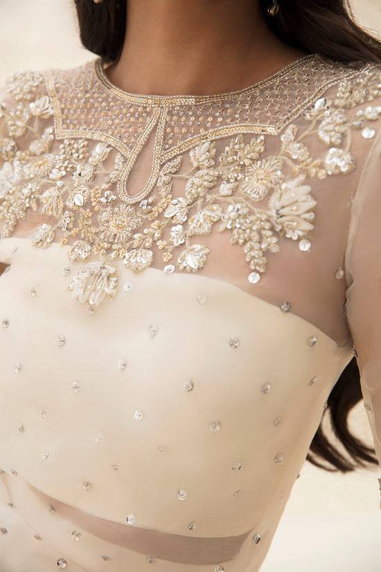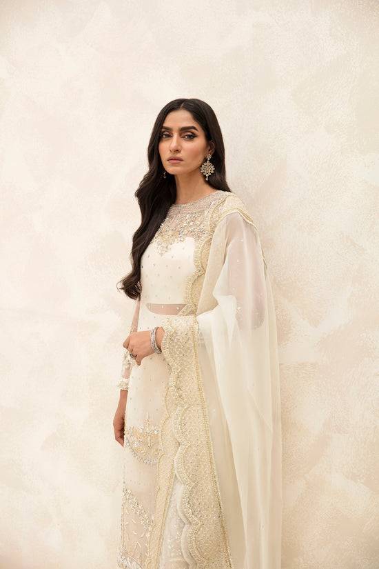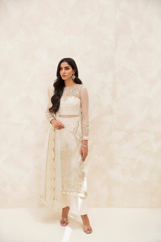 This enthralling ivory organza shirt is a true embodiment of charm and exquisite craftsmanship. Adorned with resplendent silver 3D embellishments on the neckline, hemline, and sleeves, along with sequin spray all over. Paired elegantly with Korean silk culotte pants and scalloped organza dupatta with embroidered borders, making it truly captivating in the sample that is sure to make a lasting impression.