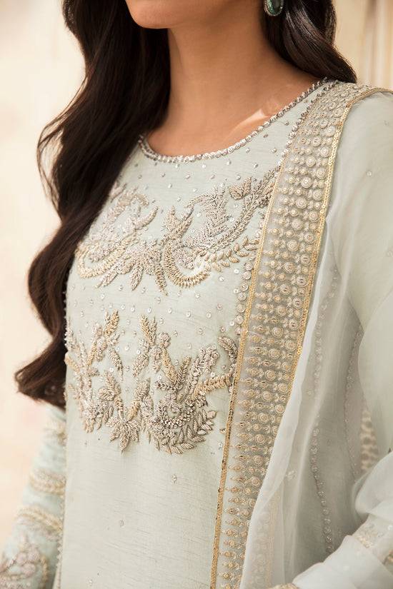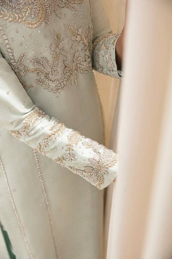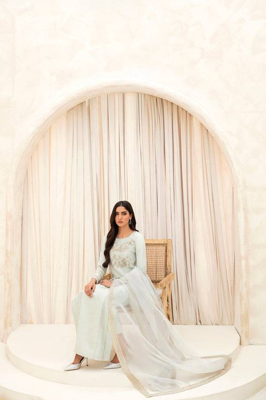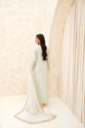 This outstanding pastel green paneled silk shirt is meticulously embellished with exquisite silver handwork on the front, back, and sleeves. The shirt panels have seamless tilla embroidery, creating a masterpiece that exudes timeless beauty. It is paired with sleek cigarette pants and organza dupatta with four-sided embroidered borders, creating a beautiful finish.