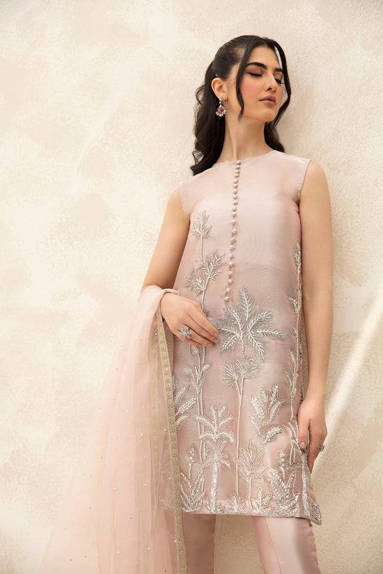 Paired with cigarette pants and organza dupatta having a four-sided embroidered border, this ensemble perfectly balances contemporary chic and timeless grace.
