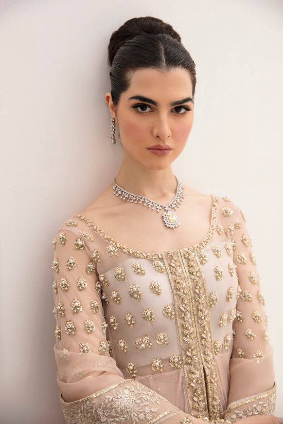 A resplendent double-layered beige rose net pishwas evokes a sense of regal allure that commands attention. It is crafted with exceptionally intricate gold embellishments of adda work on the bodice, sleeves, and hemline. The multi-head borders along the neckline and center add a touch of sophistication.